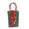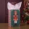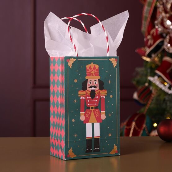 A Christmas-themed gift bag with a red and white striped handle, featuring a nutcracker figure and seasonal-inspired graphics in rich green tones. The sturdy paper construction and crisp print offer a refined presentation for presents and treats.