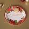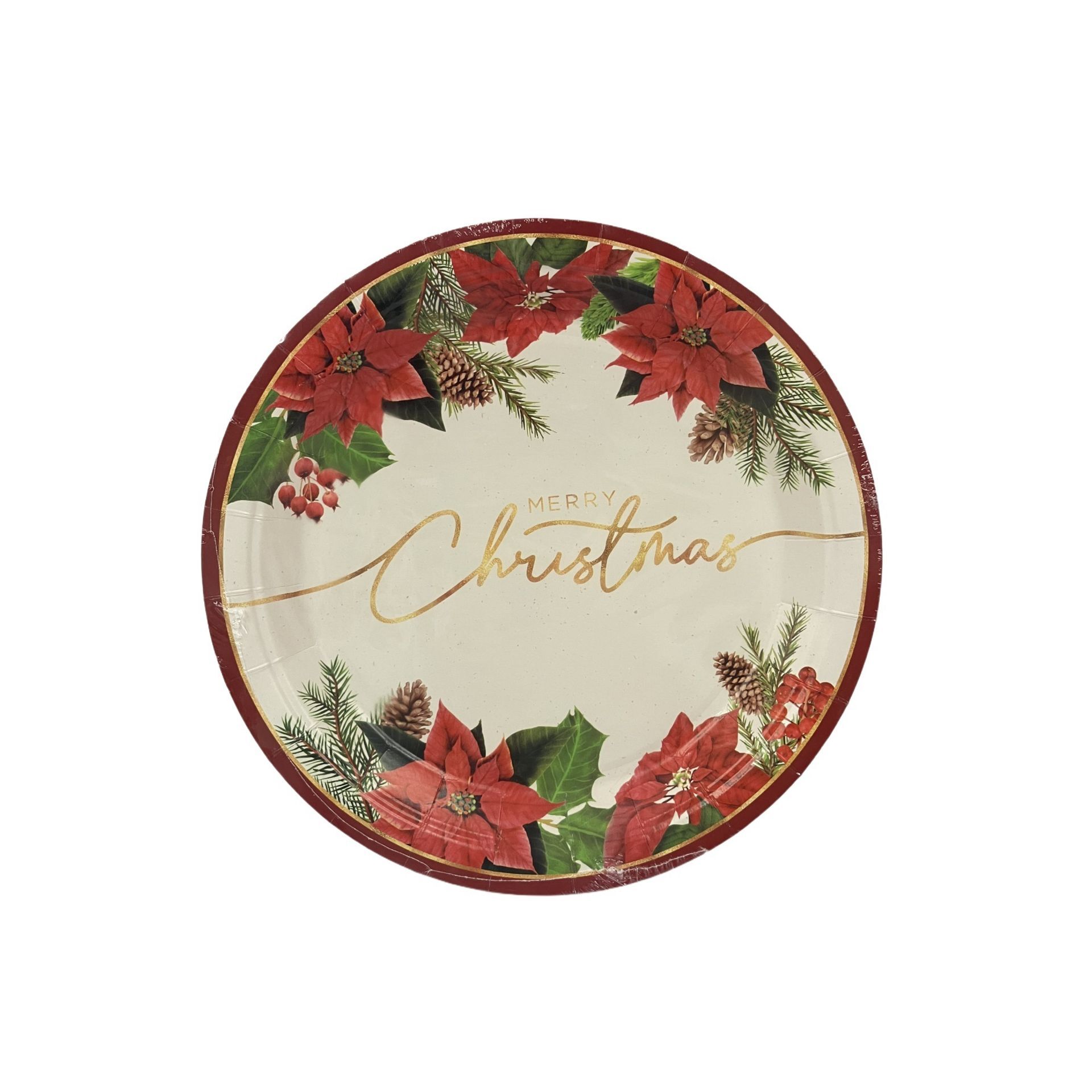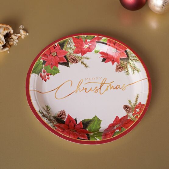 A round plate with a Christmas design featuring red poinsettia flowers, pine branches, and the text "Merry Christmas" in the centre. The vibrant motif adds a cheerful touch to any table setting.