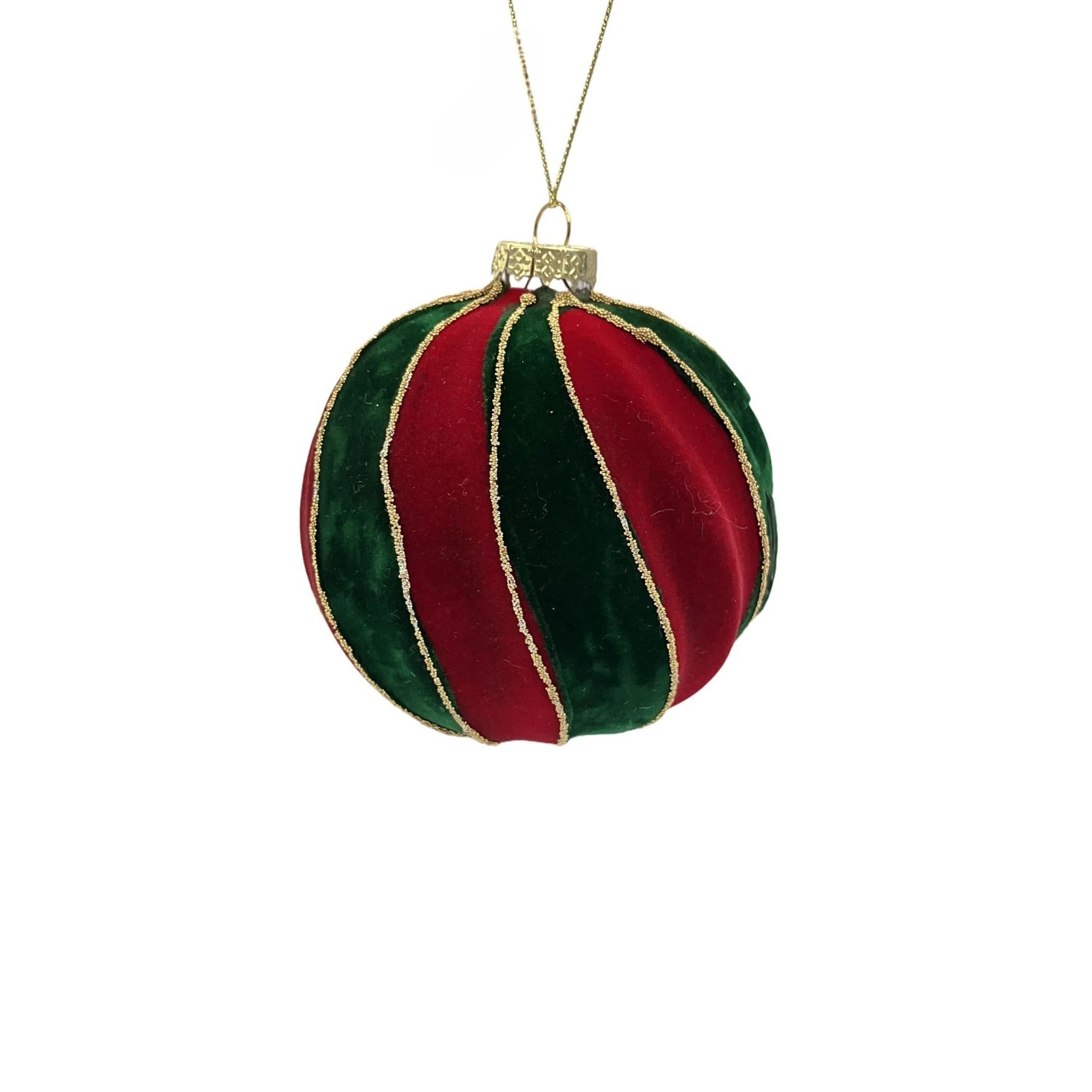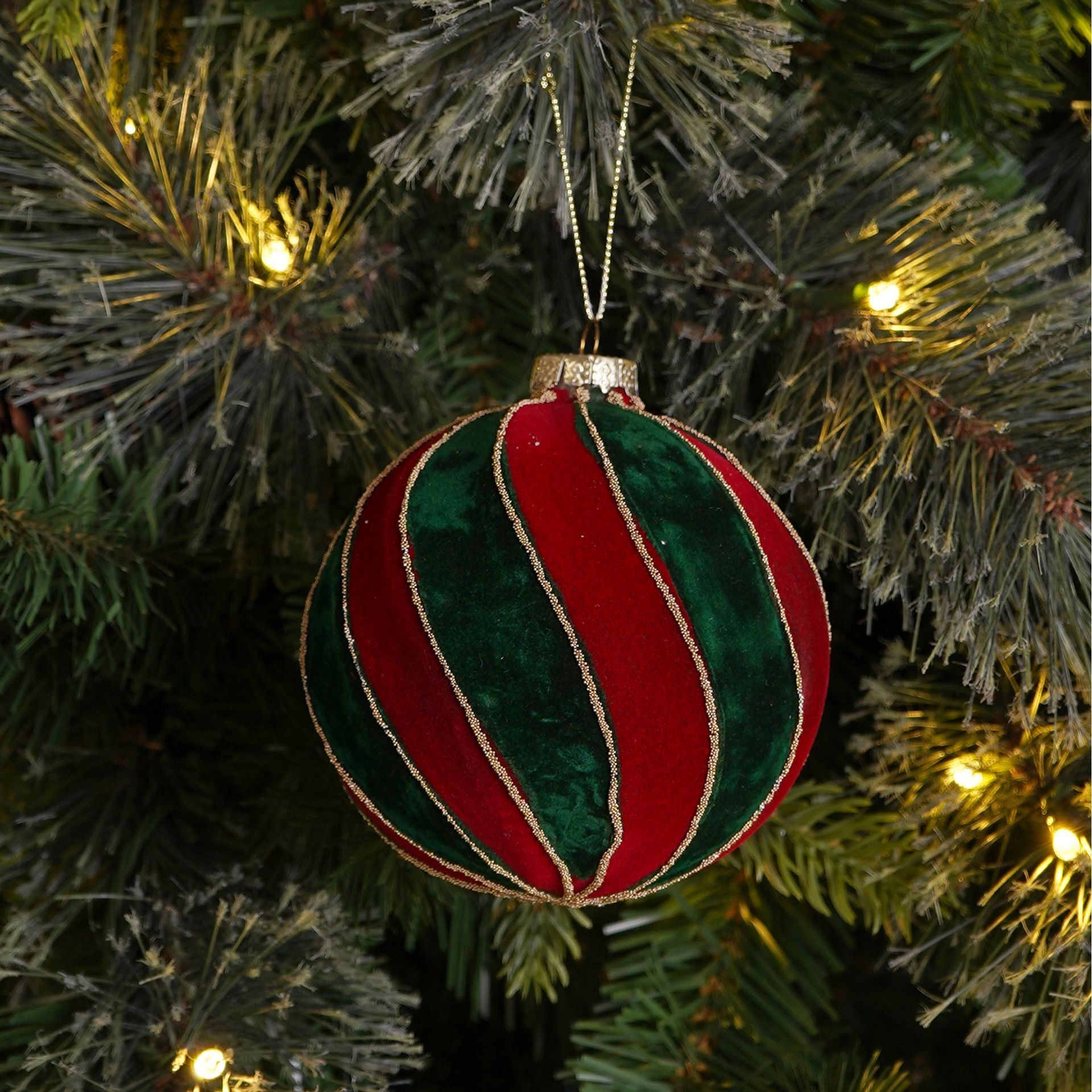 A red and green striped glass ornament features a finial silhouette, offering a refined take on traditional Christmas colour. The smooth glass surface and crisp stripes create a polished, heritage-inspired accent for the tree.
