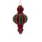 A vibrant, ornate Christmas ornament with a deep red body and green and gold stripes, with a gold hanging string. The smooth surface and bold palette evoke a sense of tradition with a modern twist.
