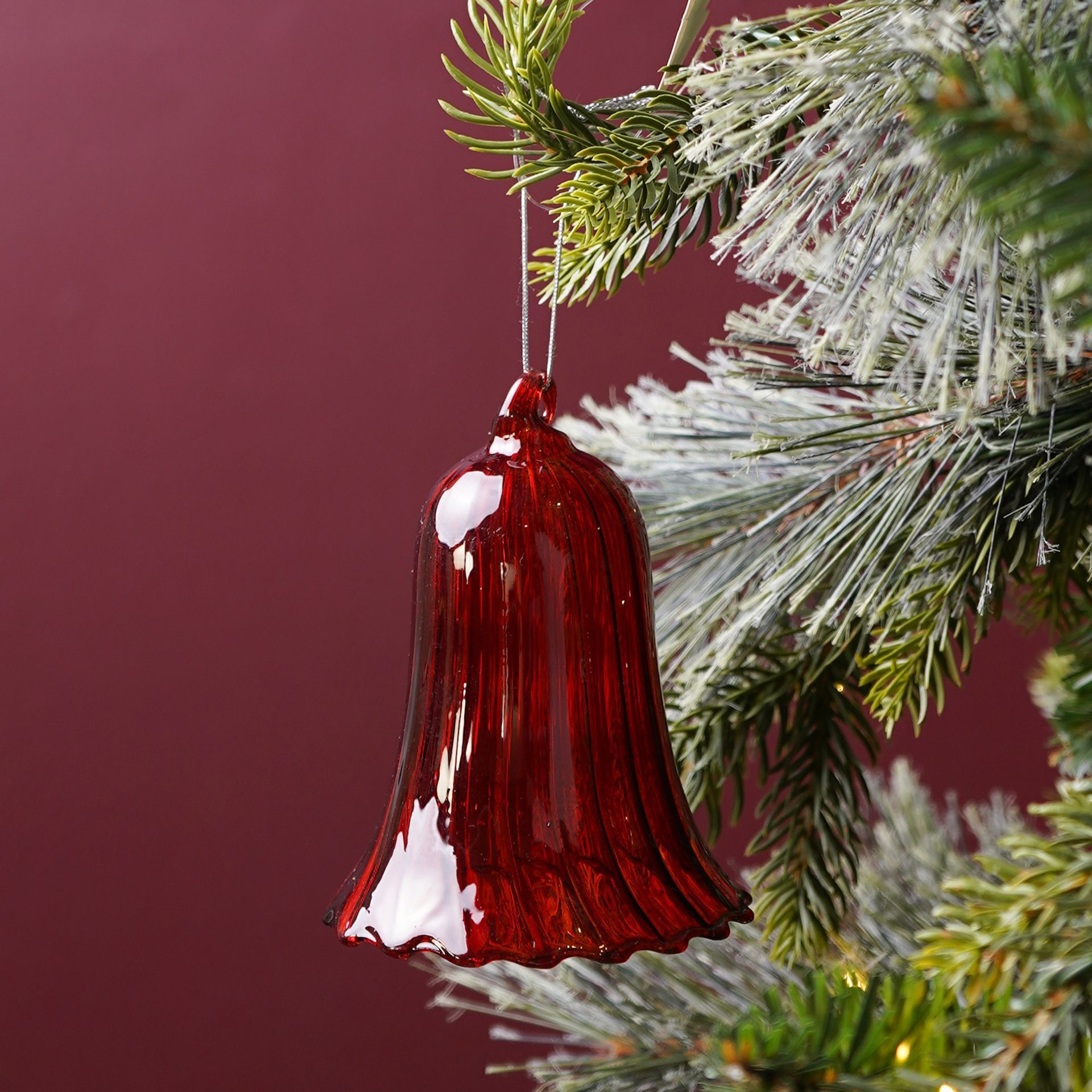 A red glass ornament in the shape of a bell hangs from a snow-covered pine branch, finished with a subtle shine and elegant contours. The rich colour and refined form evoke the warmth of traditional Christmas celebrations.