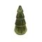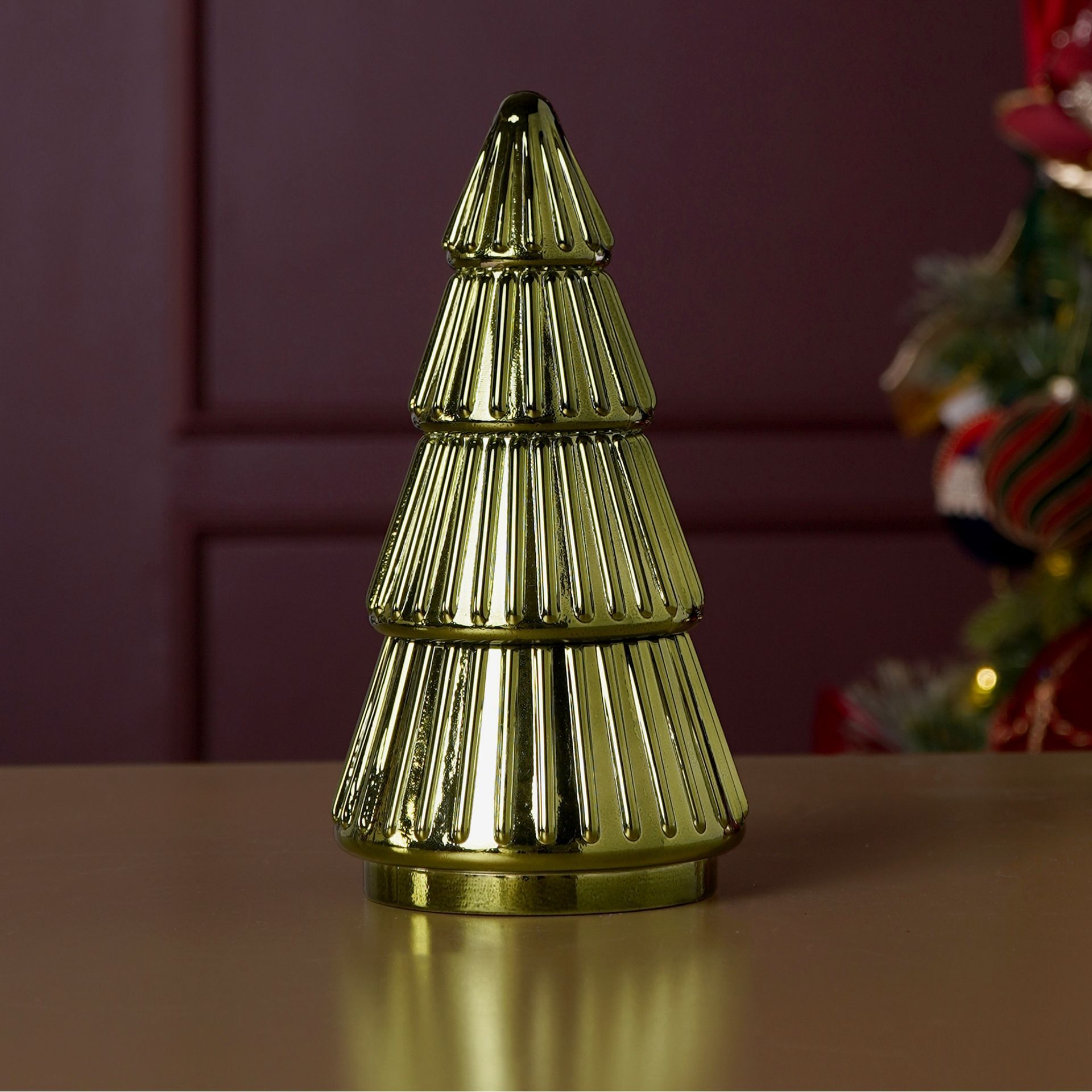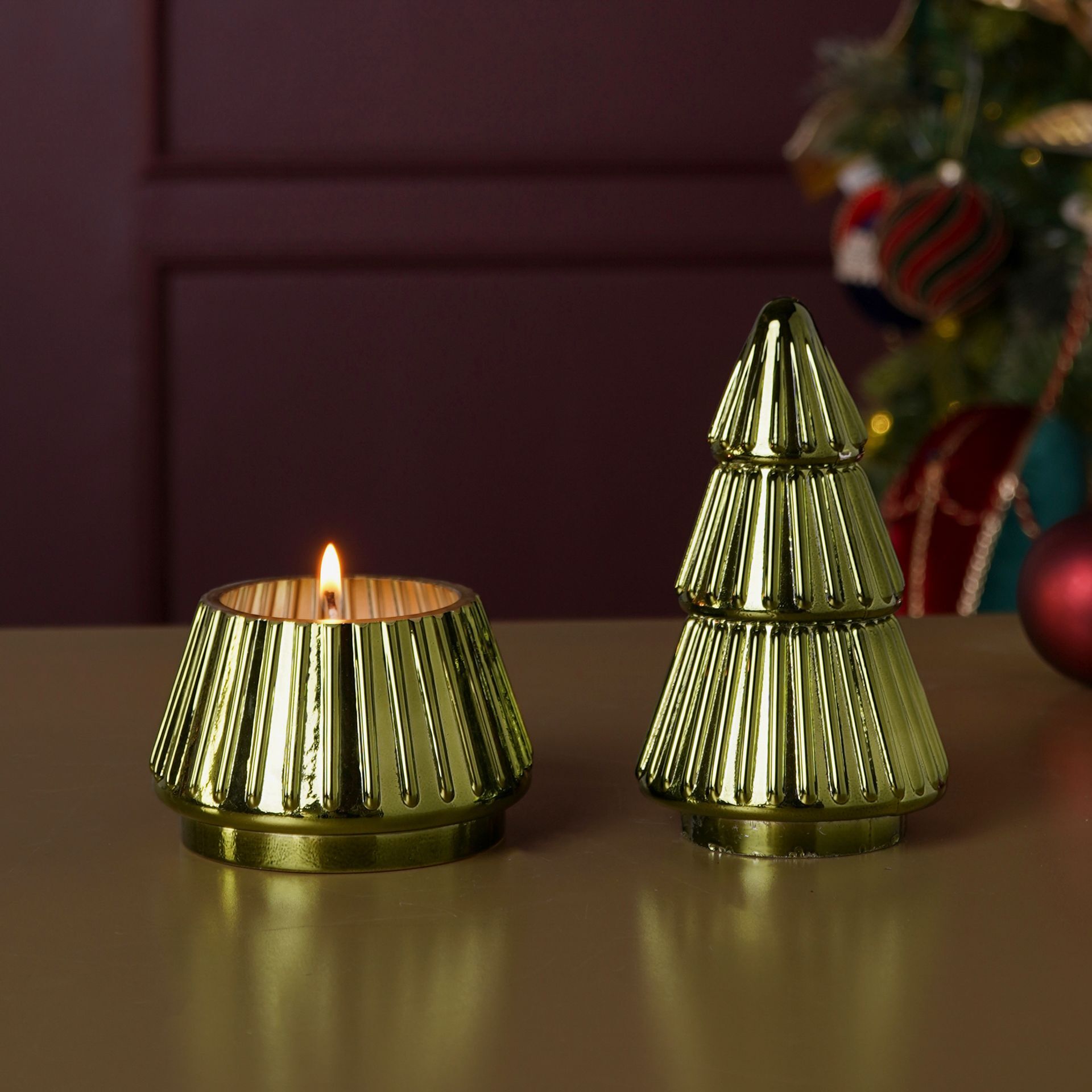 A metallic green, tiered Christmas tree-shaped ornament houses a fragranced wax candle, blending classic seasonal form with a modern glass finish. The sculpted silhouette and subtle sheen create a sophisticated centrepiece for seasonal gatherings.
