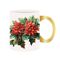The white ceramic mug features red poinsettia flowers, green holly leaves, and golden accents for a cheerful holiday look. A gold handle and matching coaster add elegance, all presented in a lidded gift box.