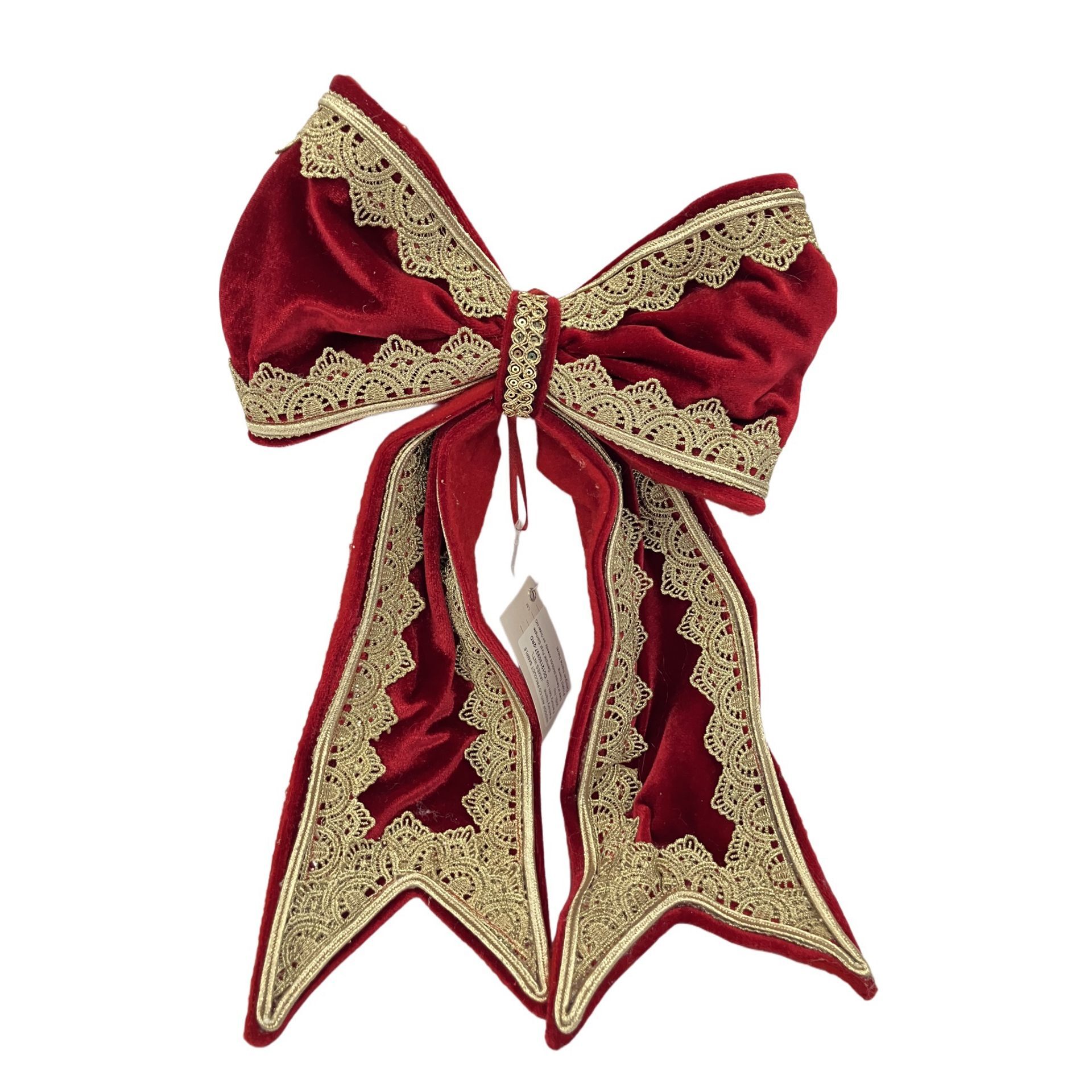 A large, ornate red and gold bow with intricate lace detailing stands out, offering a refined take on classic seasonal motifs. The structured form and rich colour palette create a sense of modern opulence.