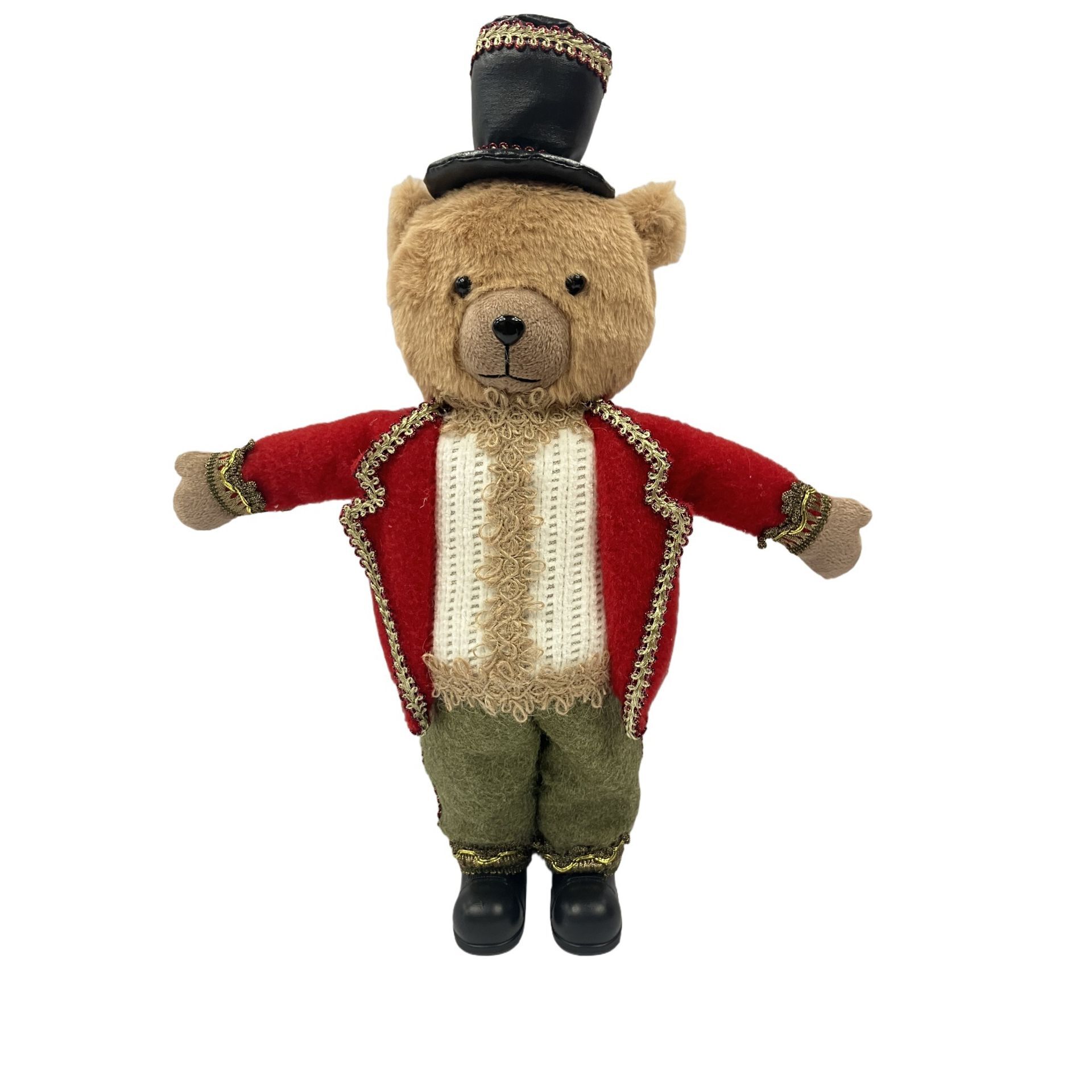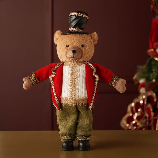 Standing Bear with Top Hat brings a classic festive character to seasonal decor, perfect for adding charm to any seasonal setting. A plush teddy bear dressed in a red coat, green pants, and a top hat stands with elegant poise. Subtle stitching and soft textures enhance its refined appeal, while the tailored outfit evokes traditional Christmas style. Pair it with other sophisticated designs from the Regal Tidings collection to complete your festive display.