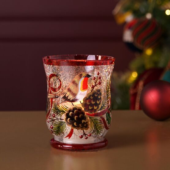 Regal Tidings Crackle Glass Votive Holder Robin Design 11cm