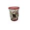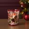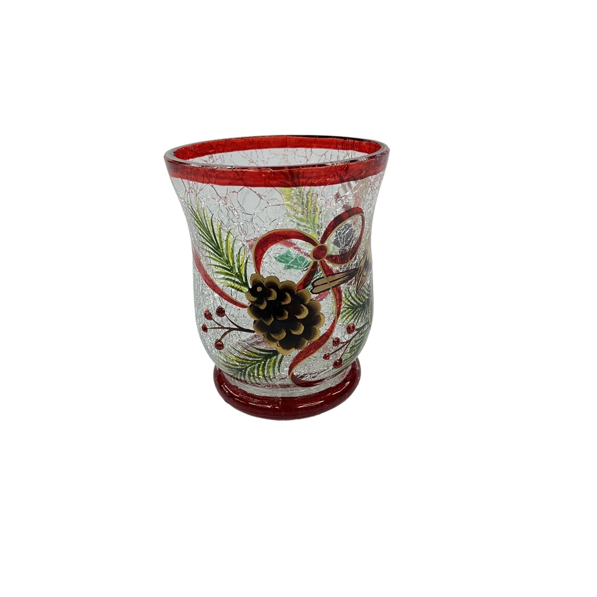 A decorative glass tumbler with a red rim and intricate floral and pine branch designs in shades of green, brown, and red. The crackle glass finish adds subtle texture, while a robin motif lends a classic Christmas touch.