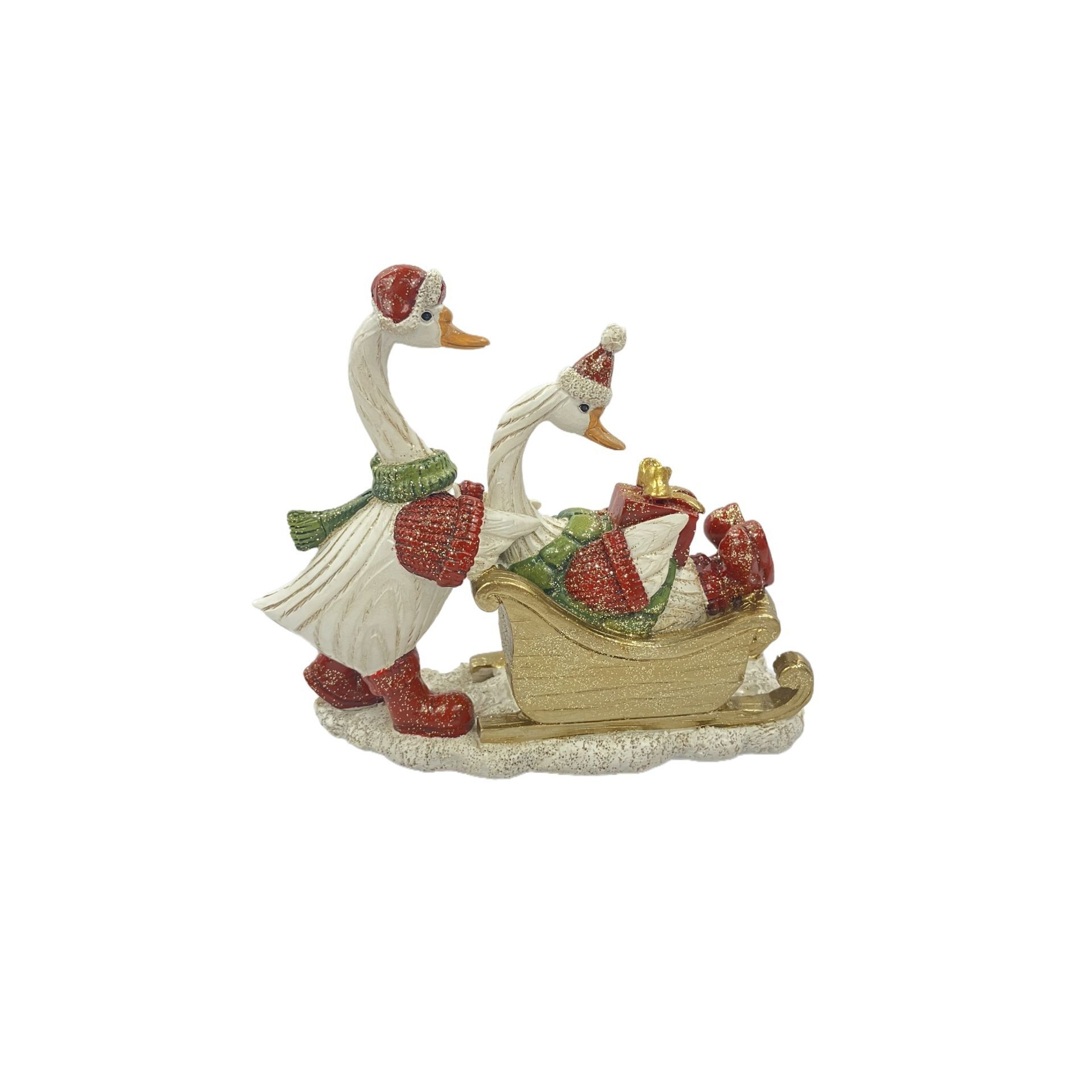 Two white geese pull a wooden sled. The gentle contrast of crisp white and vibrant red adds a fresh accent to traditional Christmas decor.