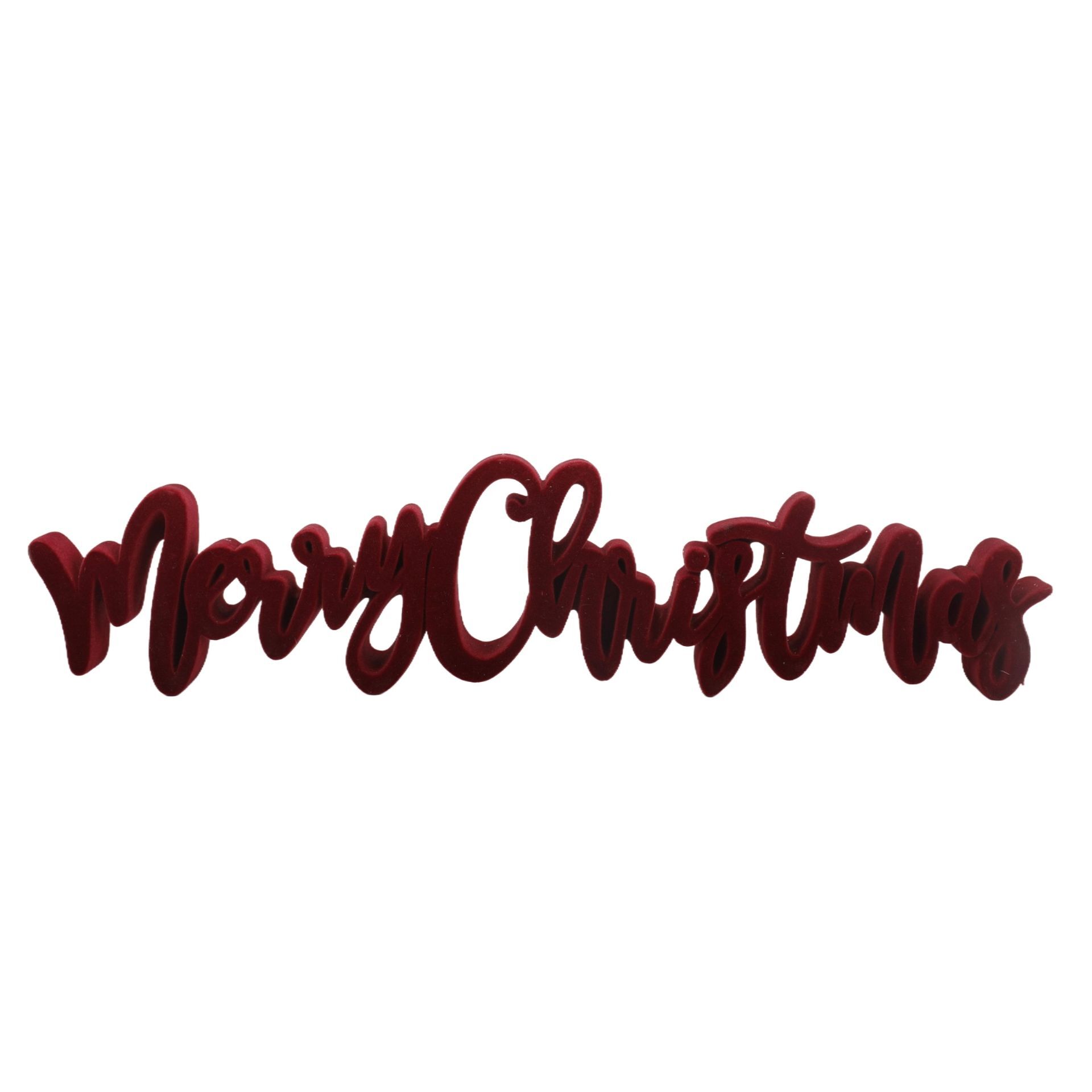 The image displays the text "Merry Christmas" written in a cursive, burgundy-coloured font, offering a classic festive message with a modern twist. The flocked finish adds subtle texture and depth to the design.