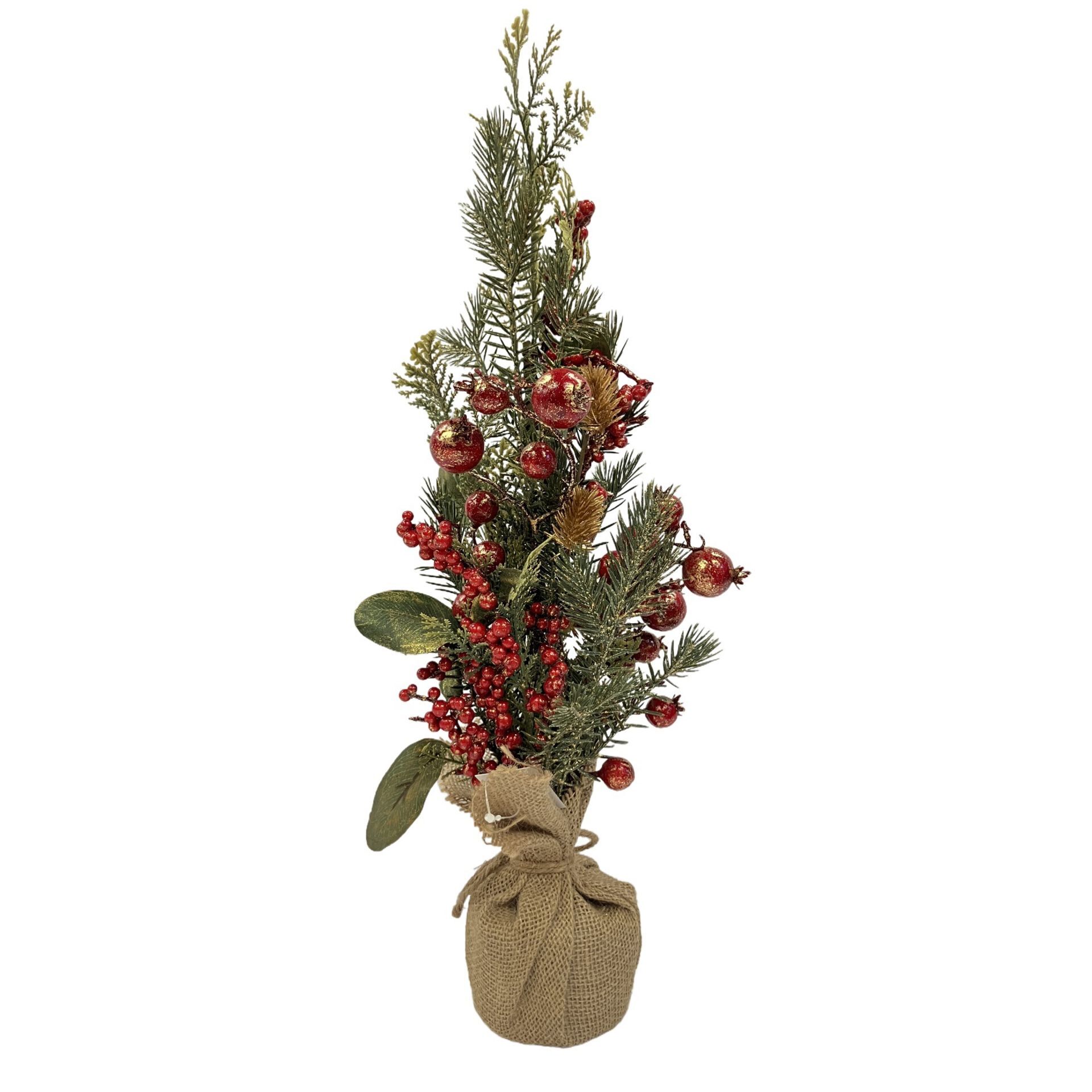 A festive seasonal arrangement featuring a small evergreen tree adorned with red berries, pine cones, and other natural decorative elements. Presented in a rustic jute bag, it blends tradition with contemporary charm.