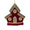 A red and gold ornamental Christmas tree decoration with a pointed roof and intricate lace-like patterns adorning its surface. The glossy finish and delicate detailing evoke a sense of refined tradition with a modern touch.