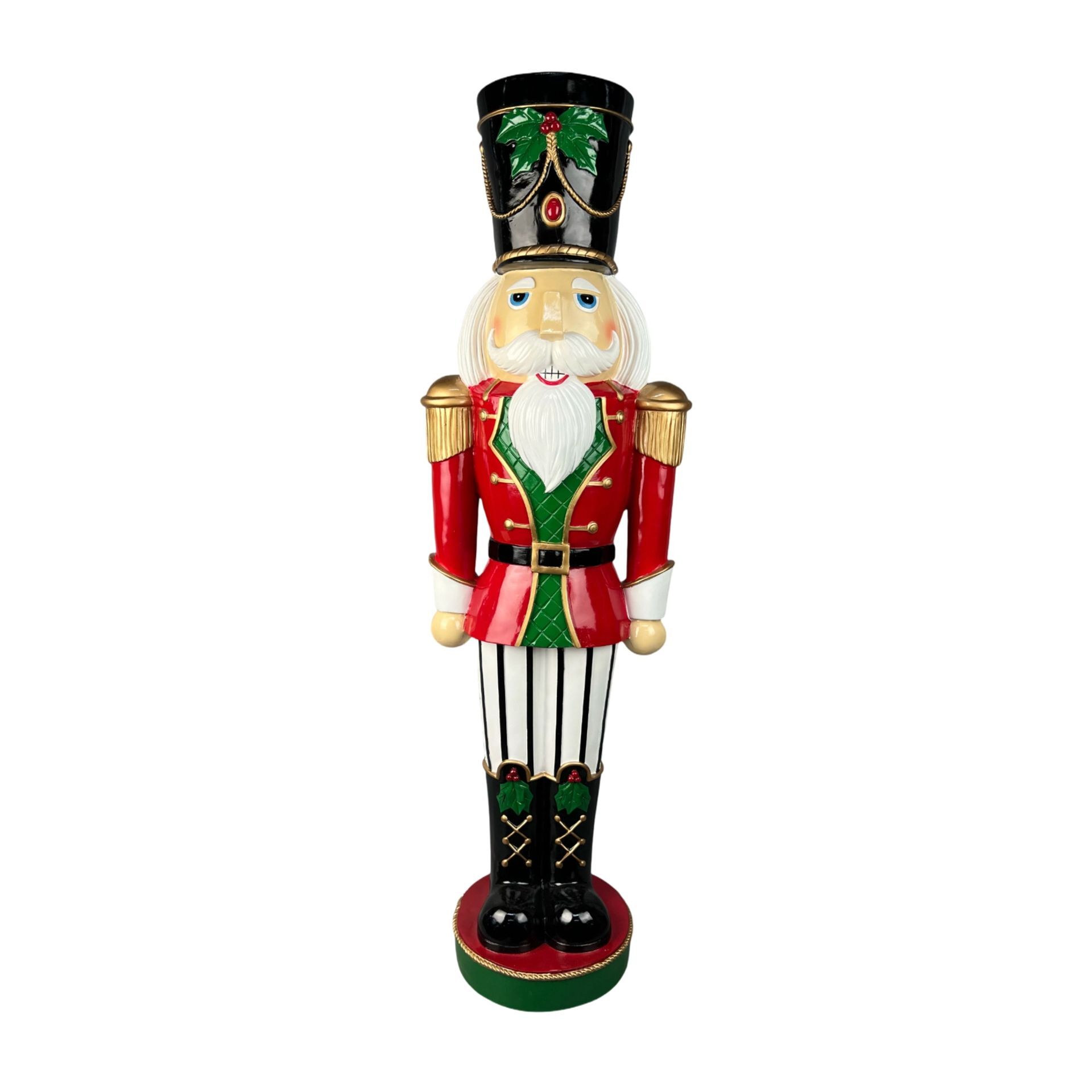 This lifesize colourful nutcracker figure is dressed in a classic red and green uniform, finished with gold accents and a tall black hat adorned with a feather. Its cheerful expression and bold stature evoke the playful spirit of traditional Christmas decor.
