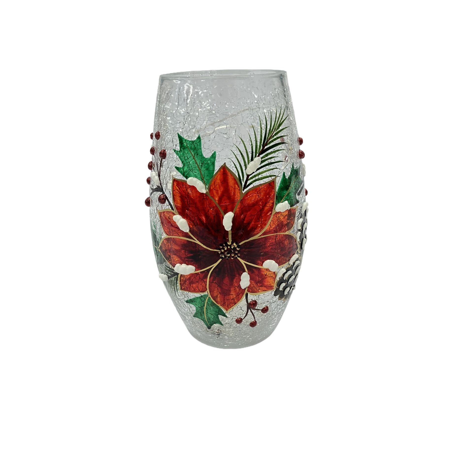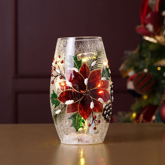 A clear glass tumbler features a vibrant red poinsettia flower, green leaves, and pine branches, all set against a crackle effect finish. The integrated LED light adds a gentle glow, enhancing the seasonal-inspired design with modern flair.