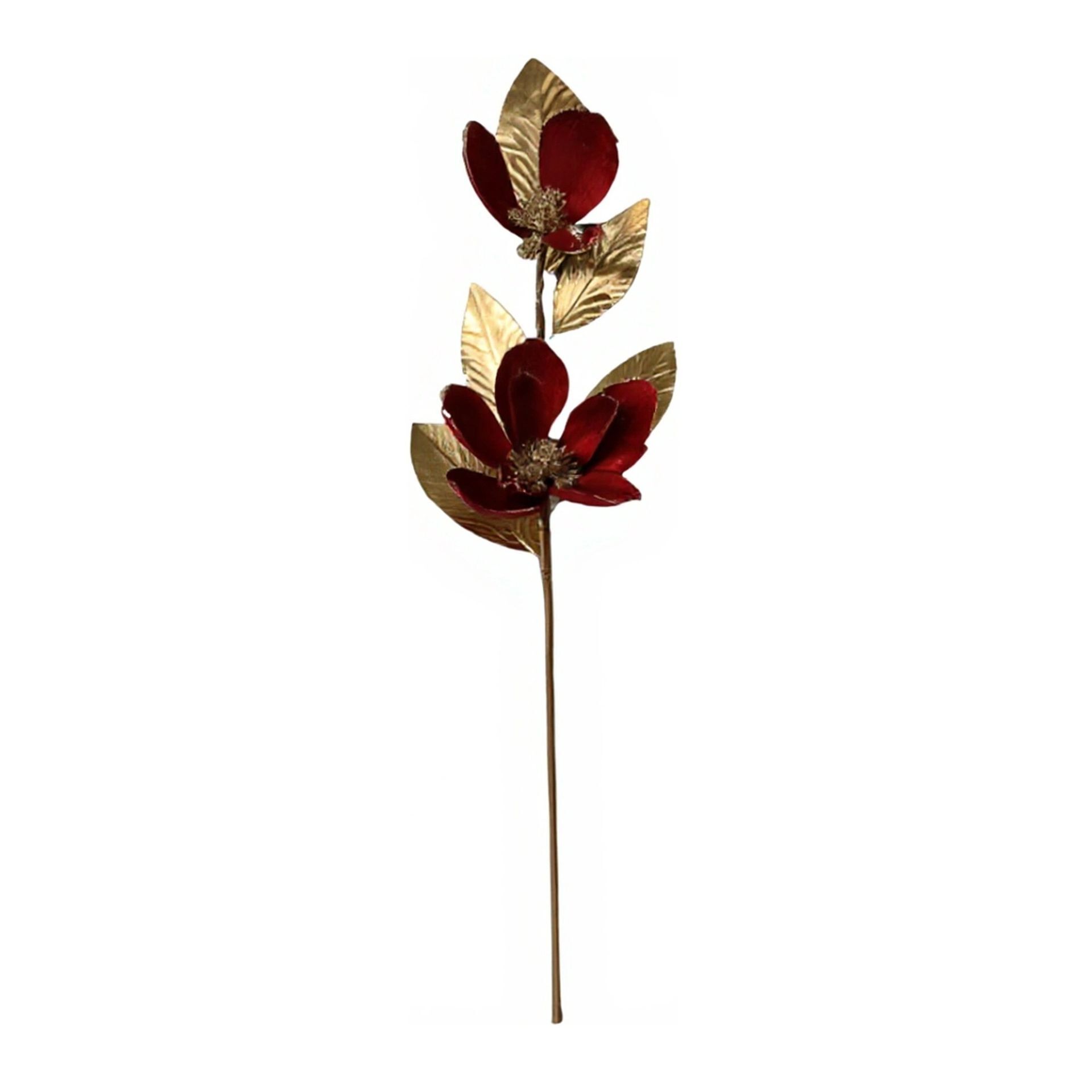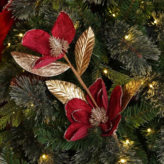 The Regal Tidings Red & Gold Tree Stem brings a refined festive accent to seasonal arrangements, perfect for adding a touch of elegance to your seasonal decor. This decorative floral stem features three stylised red and gold flowers set on a metallic branch. The rich colour palette and sculpted forms evoke a sense of modern opulence while nodding to classic Christmas tradition. Pair it with other refined designs from the Regal Tidings collection to complete your festive display.