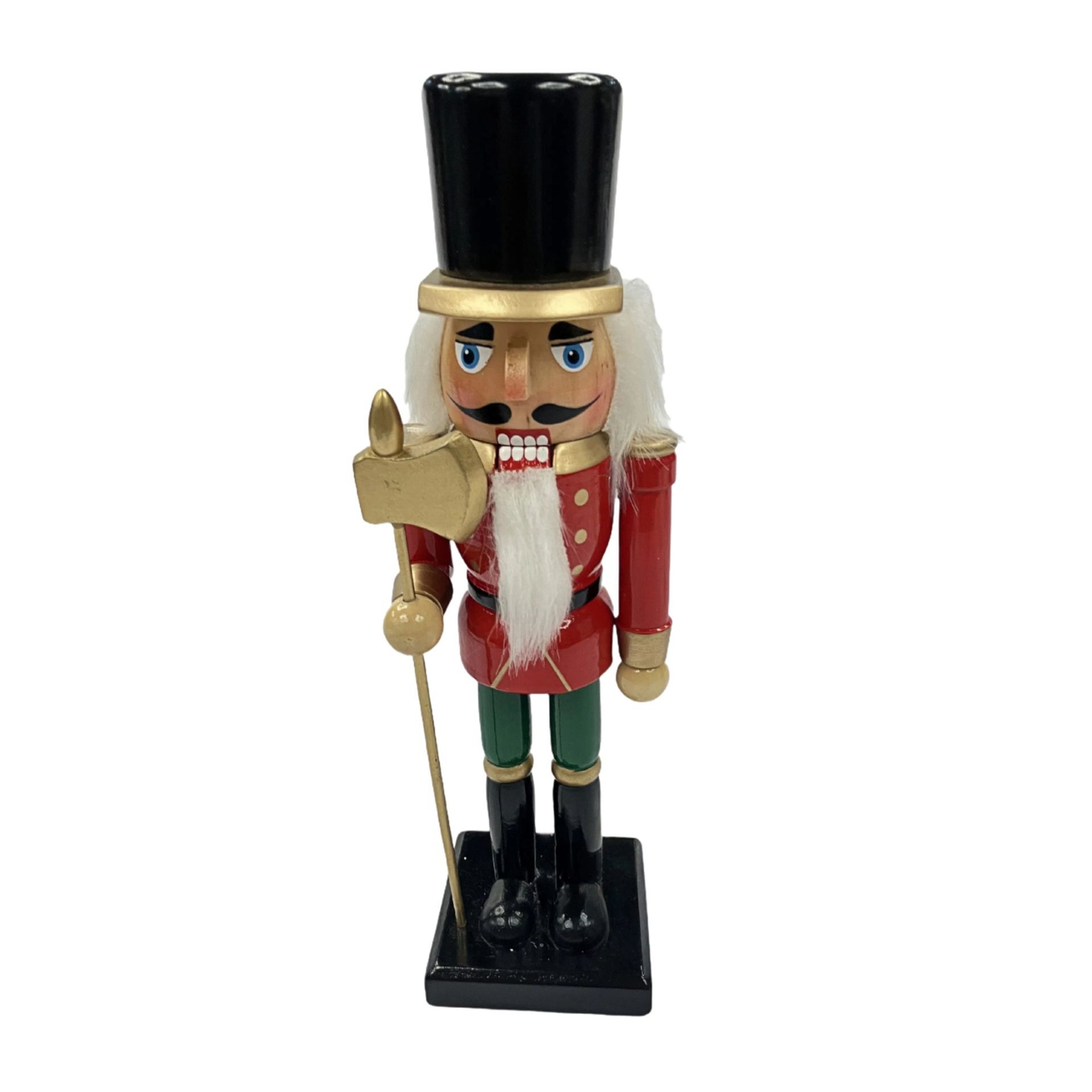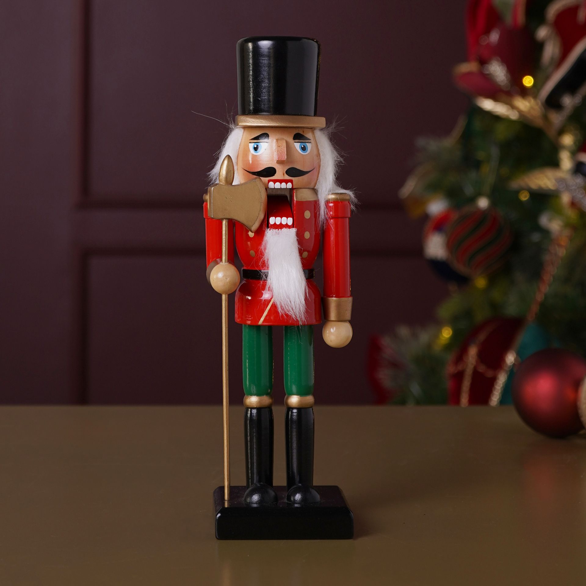 The Regal Tidings Red & Green Nutcracker brings timeless Christmas charm to festive interiors, making it a perfect addition to seasonal decor. This wooden nutcracker figure features a striking red and green uniform, a regal scepter, and stands proudly on a sturdy black base. Gold accents and painted details enhance its traditional design, exuding elegance. Pair it with other refined pieces from the Regal Tidings collection for a cohesive festive display.