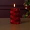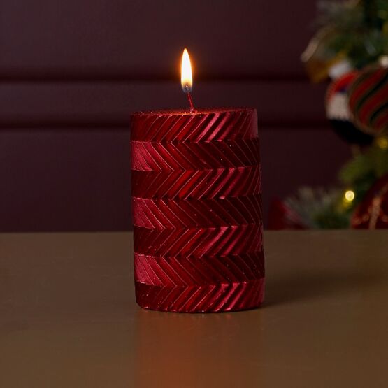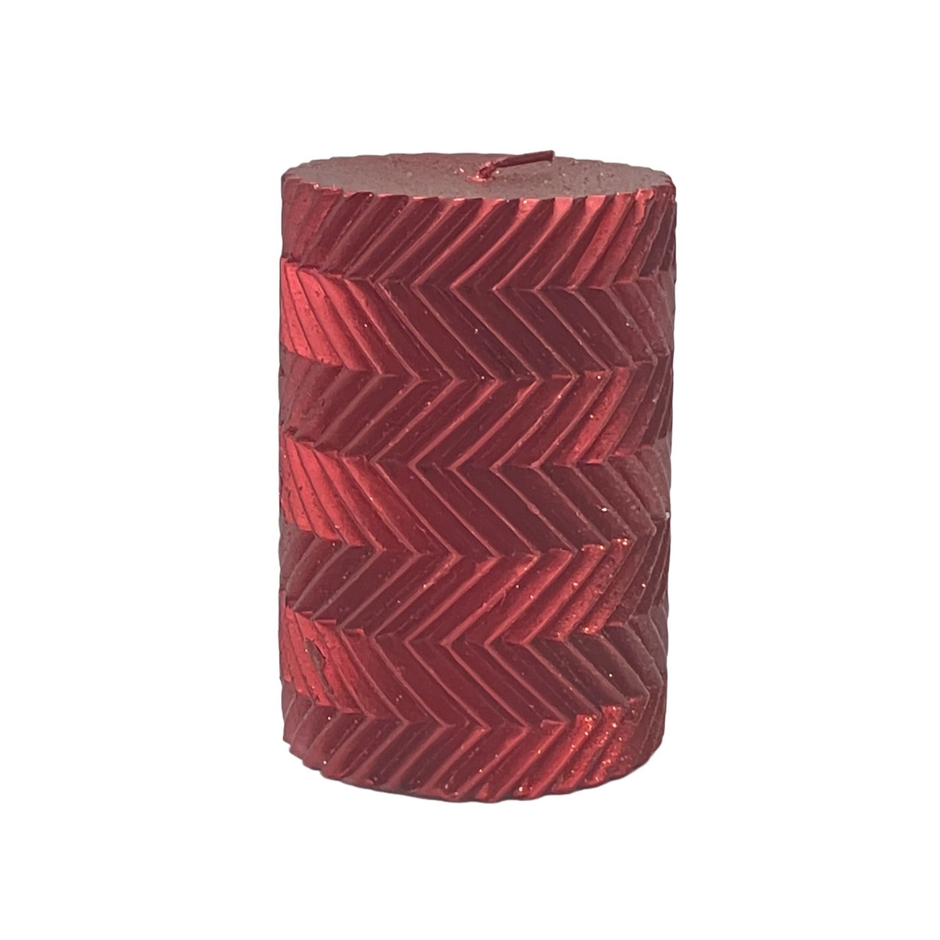 A cylindrical red candle with a chevron pattern is the sole focus of the image, offering a bold yet understated accent for festive arrangements. The embossed surface adds subtle depth and visual interest to traditional candlelight.