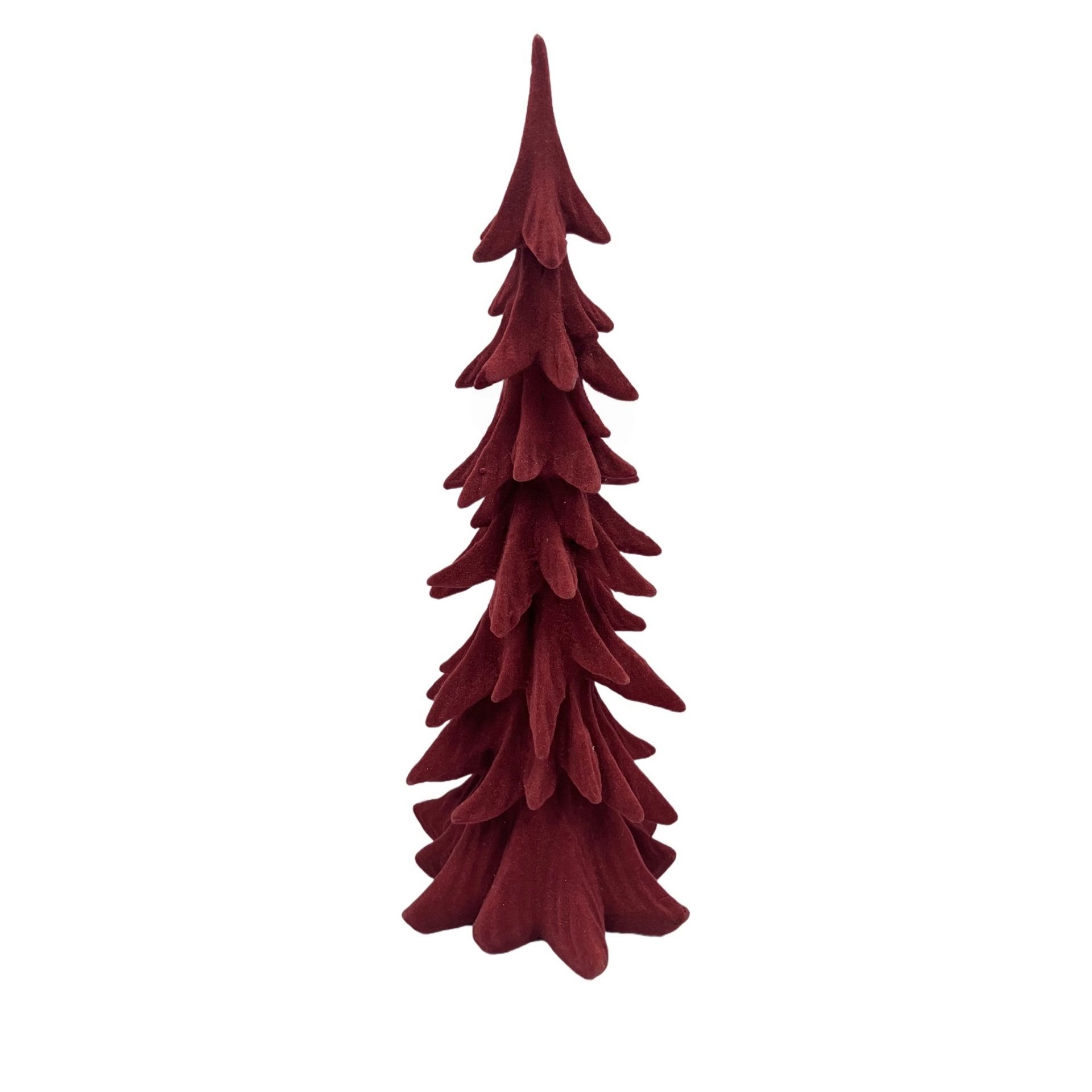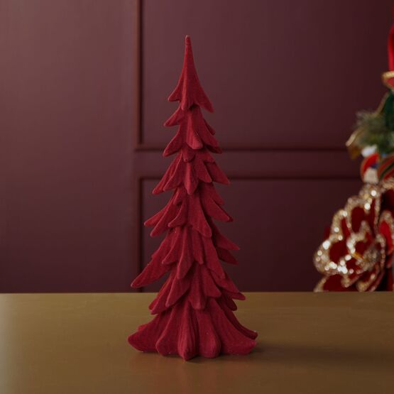 The Regal Tidings Red Flocked Tree Decoration brings a statement of festive tradition to seasonal interiors, blending timeless charm with modern elegance. This tall, burgundy-coloured Christmas tree-shaped decoration features a soft flocked finish for a plush, contemporary look. The rich red hue and sculpted silhouette offer a refined take on classic seasonal style. Complete the look with designs from the Regal Tidings collection.