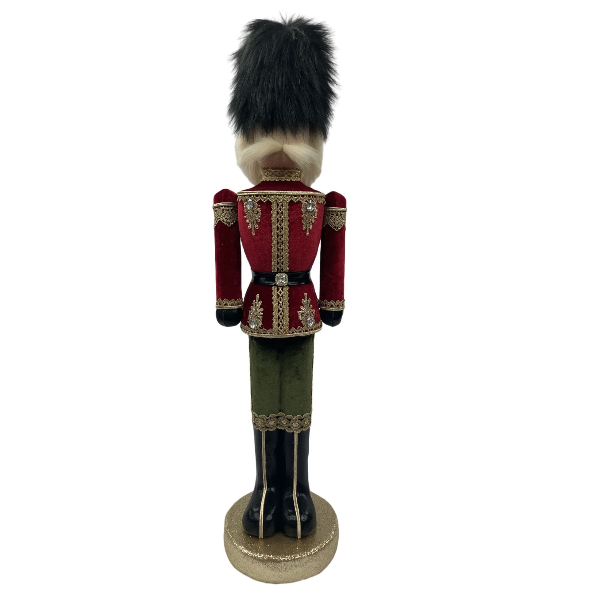 A wooden nutcracker soldier figure with a black furry hat, a red and gold uniform, and a green skirt stands on a wooden base. The detailed craftsmanship and bold festive colours add a stately presence to any display.