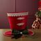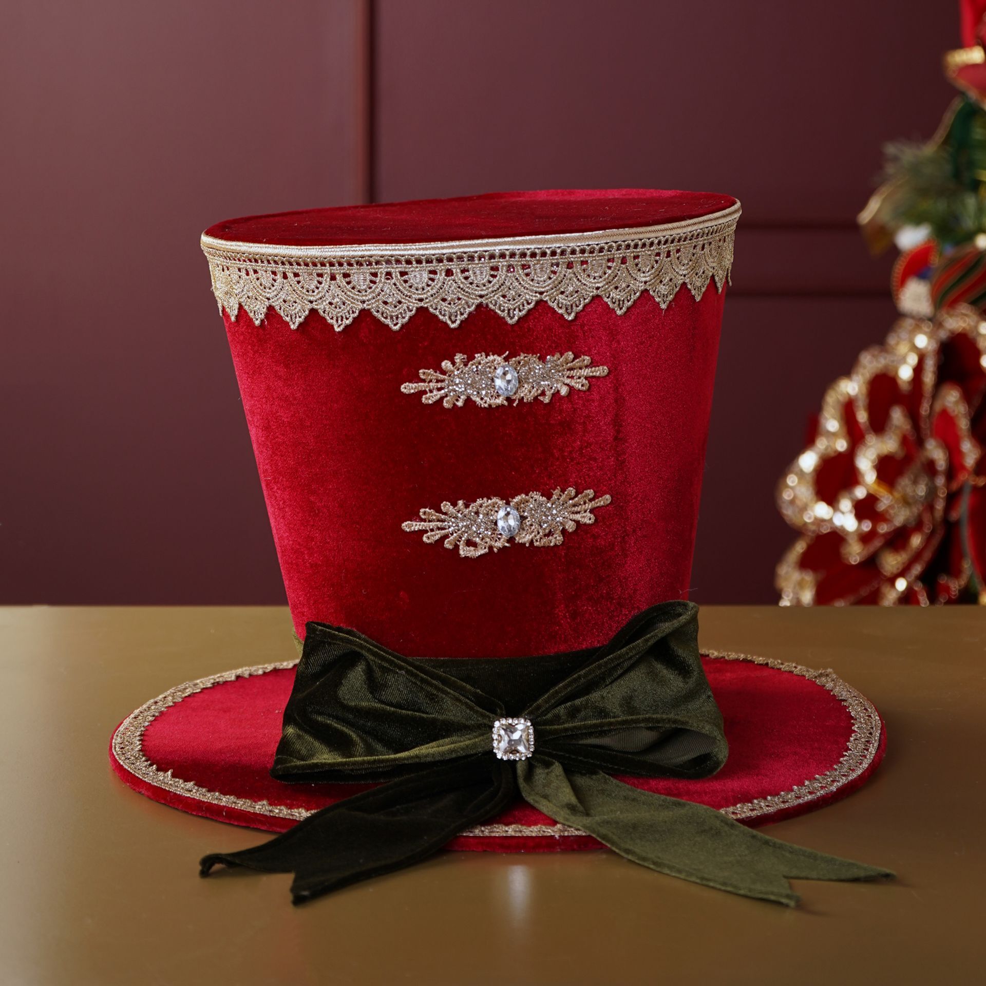 The Regal Tidings Red Top Hat adds a touch of festive tradition and elegance to seasonal decor, making it a standout piece for seasonal celebrations. Crafted from luxurious red velvet, it features intricate gold trim and a charming green bow, blending classic Christmas style with a modern twist. Its structured form and plush texture exude sophistication, perfect for enhancing any display. Pair it with other designs from the Regal Tidings collection to complete your arrangement.