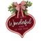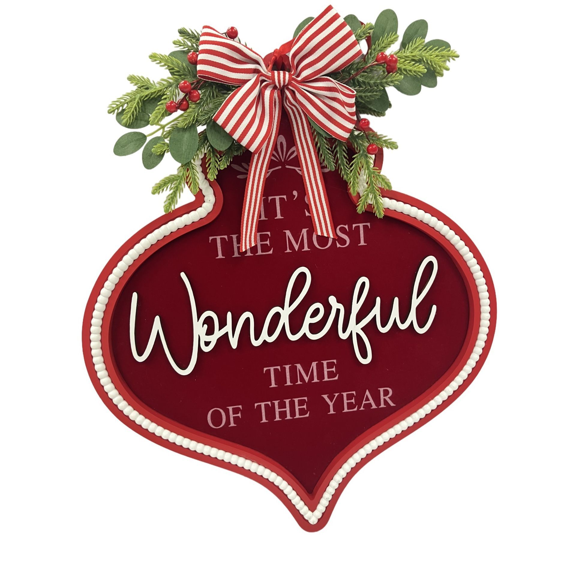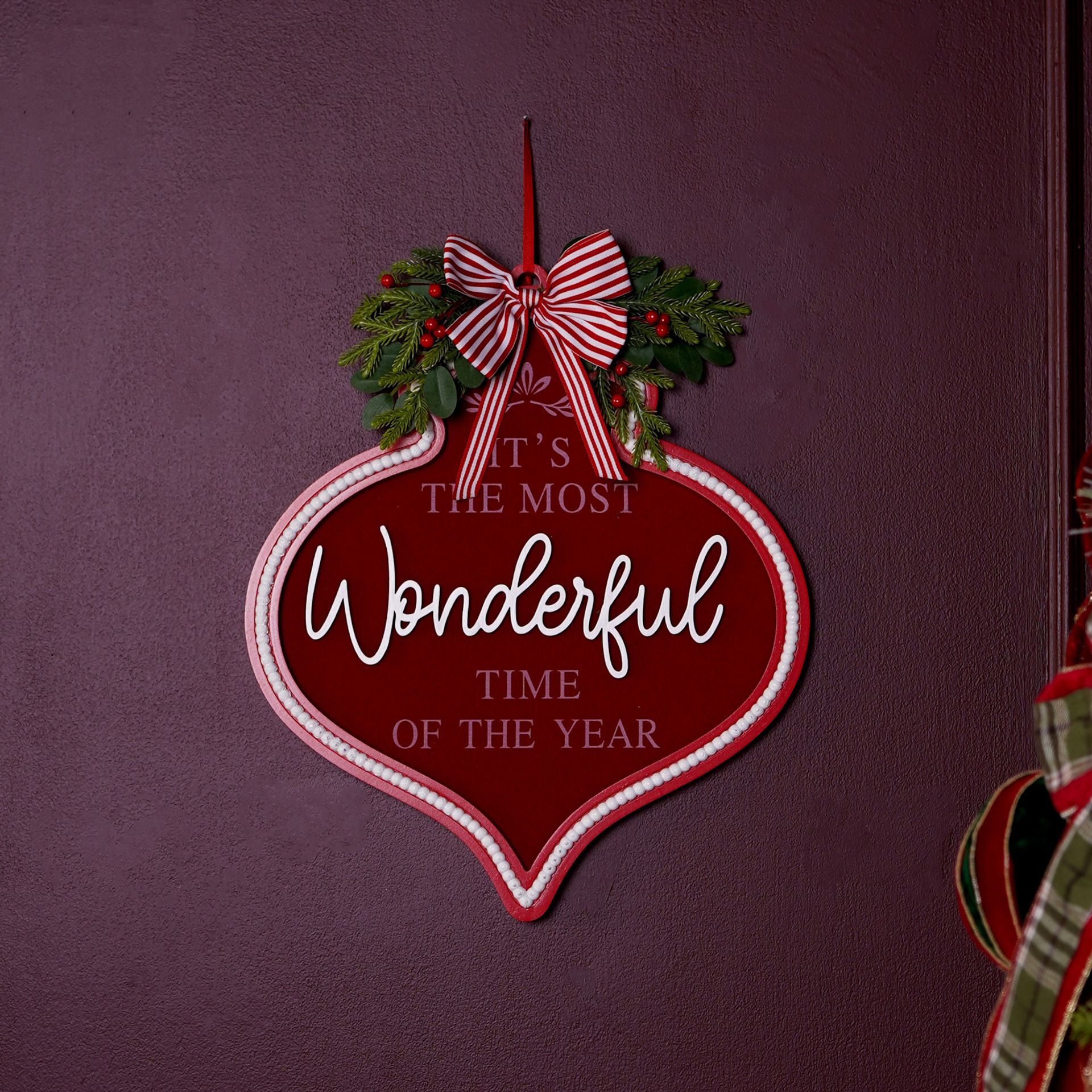 A festive red and white ornament with a striped bow, surrounded by evergreen leaves and berries, displays the text "The Most Wonderful Time of the Year". The plaques classic palette and crisp lettering evoke a sense of tradition with a modern touch.