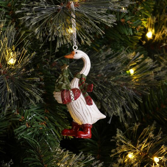 The Regal Tidings Resin Duck Hanging Tree Decoration adds playful charm and character to festive trees, making it a delightful addition to seasonal decor.