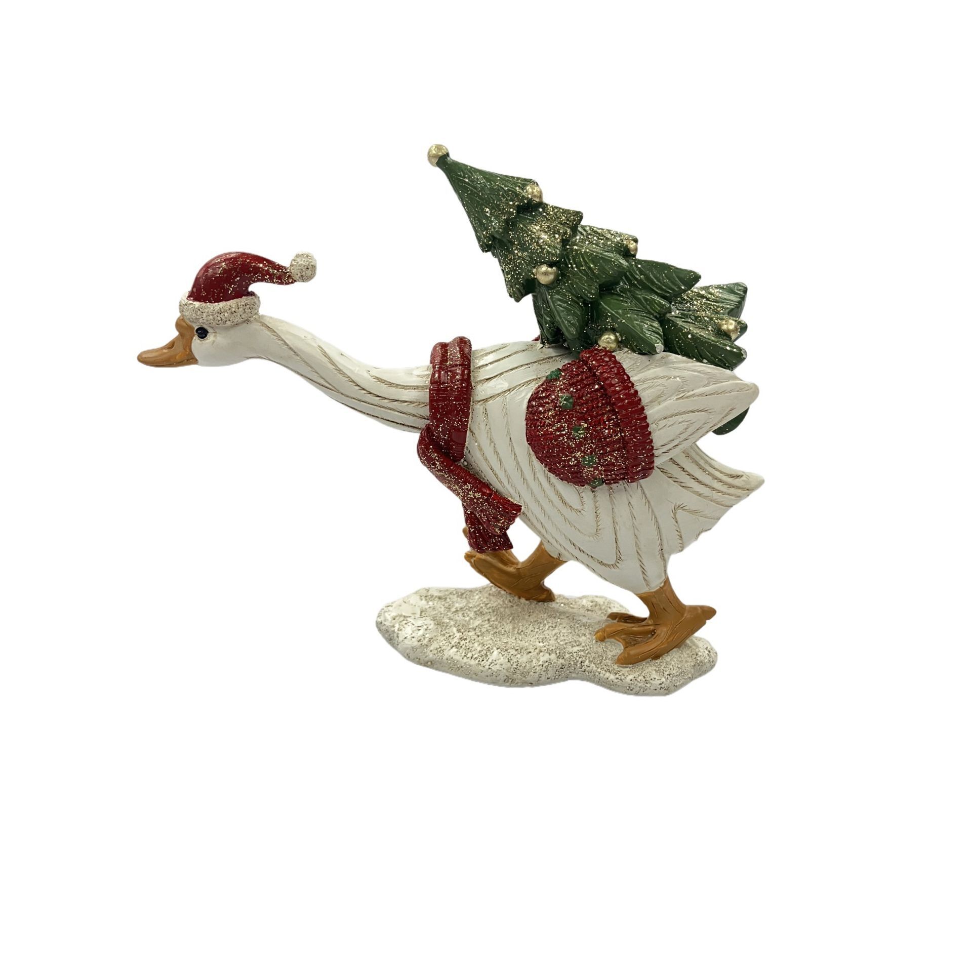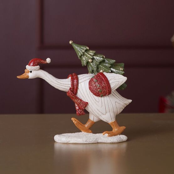 Resin Duck with Christmas Tree Figurine brings festive character to seasonal decor, adding charm and elegance to your seasonal display. This decorative figurine features a duck wearing a Santa hat and carrying a Christmas tree, standing proudly on a snowy base. Crafted in durable resin, it showcases subtle painted details and a gentle winter palette for a refined touch. Complete the look by pairing it with other sophisticated designs from the Regal Tidings collection.