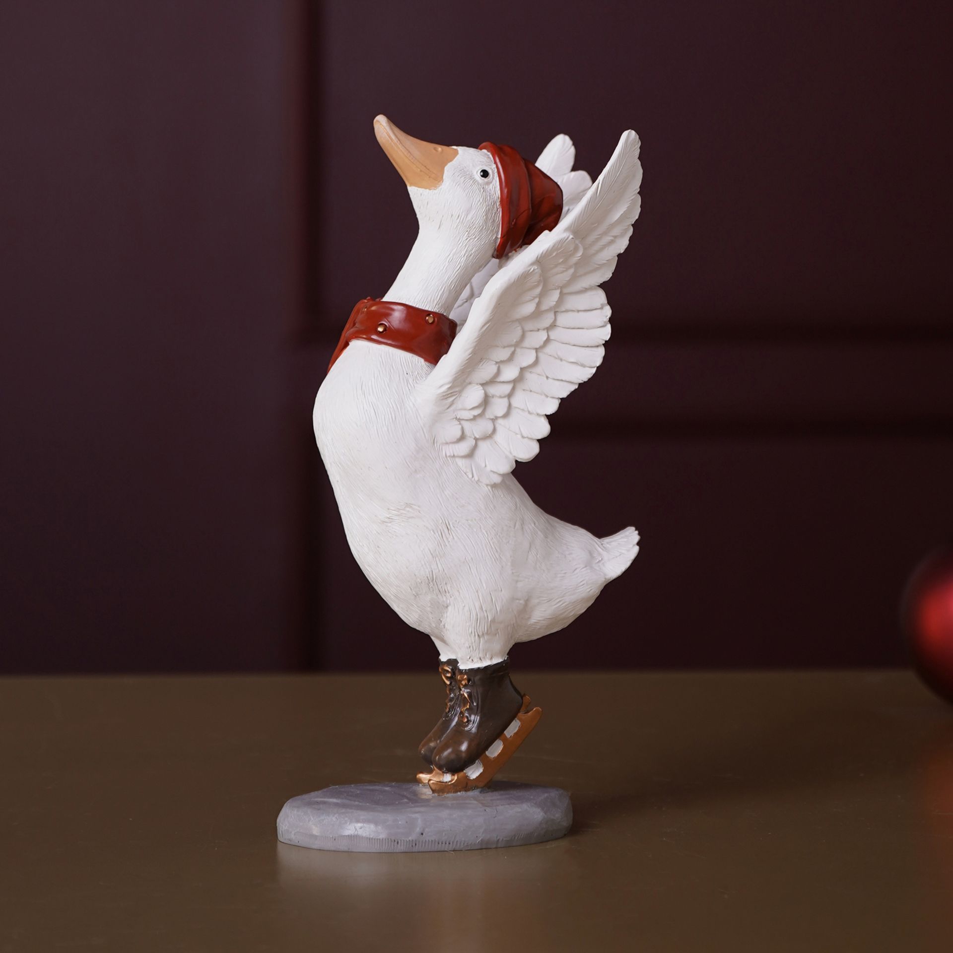 A white ceramic figurine of a duck with wings spread, this ornament stands gracefully on a grey base. The duck is finished with a charming hat and scarf, adding a touch of seasonal character to its classic form.