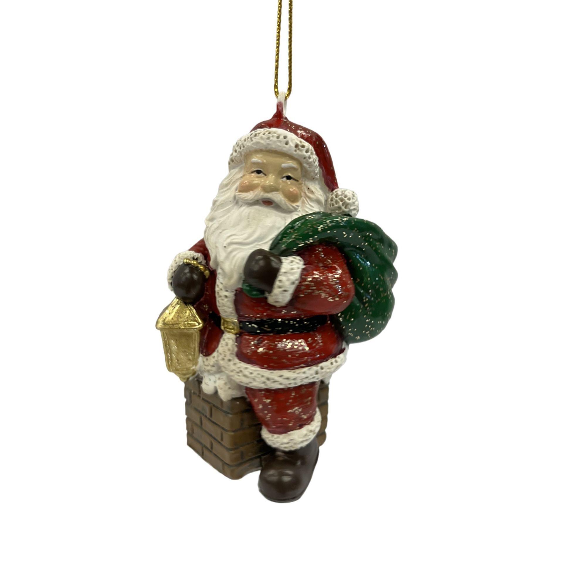 A jolly Santa Claus figurine holds a sack and stands in front of a brick chimney, adorned with a green wreath. Painted in traditional red and white with gold accents, it features a hanging loop for easy placement on the tree.