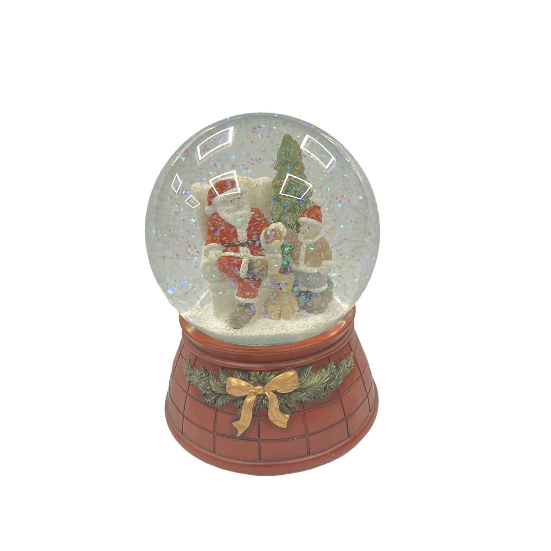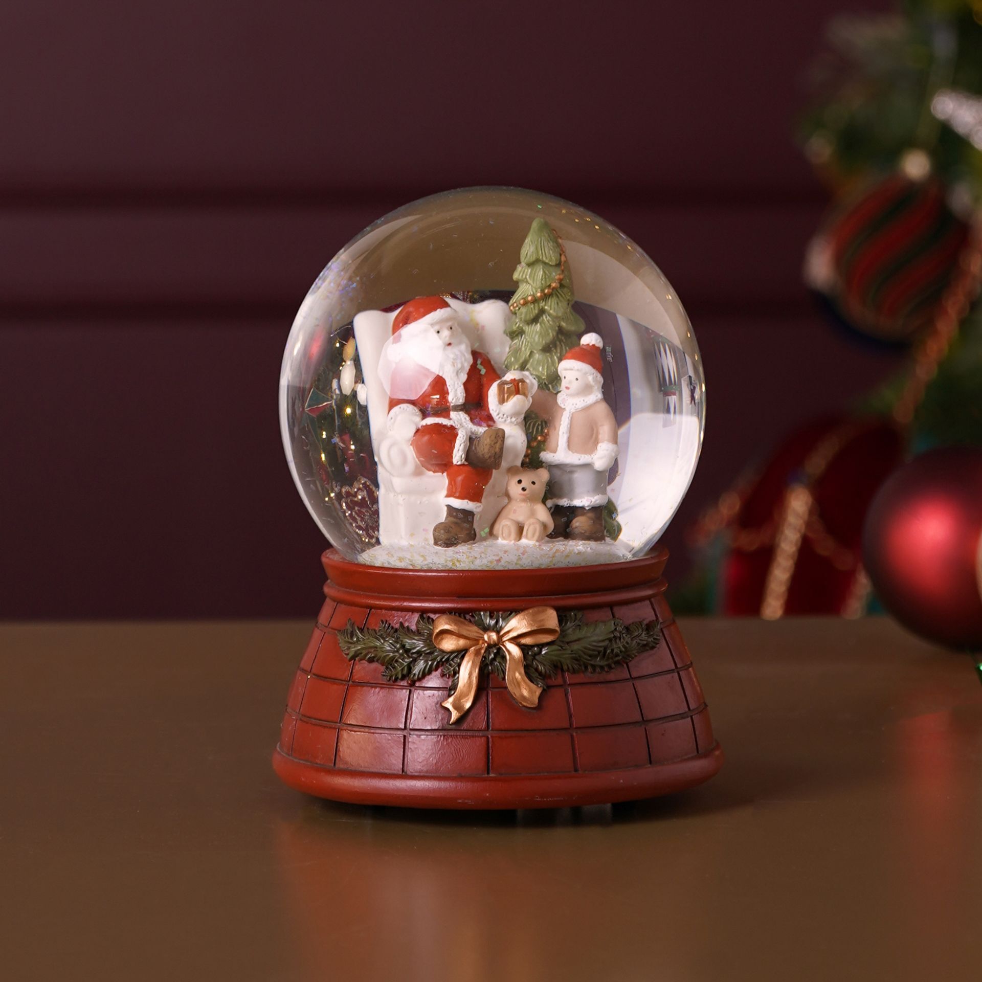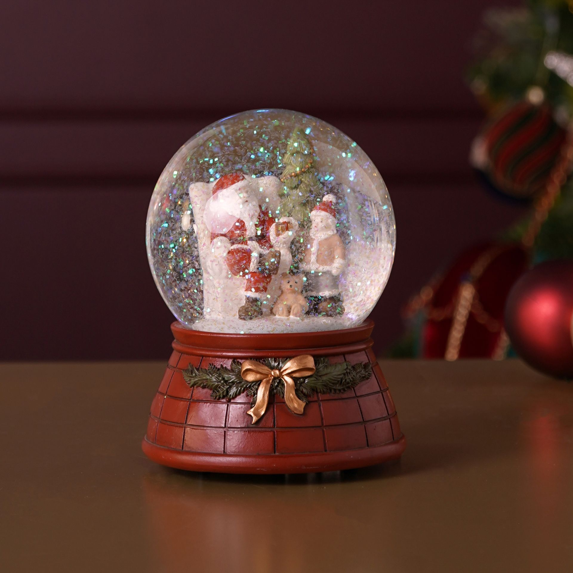 A snow globe containing a festive scene with Santa Claus and a child, surrounded by a wreath and a brick-like base. The classic form is enhanced by subtle detailing and a gentle musical feature, creating a refined centrepiece for mantel or tabletop.