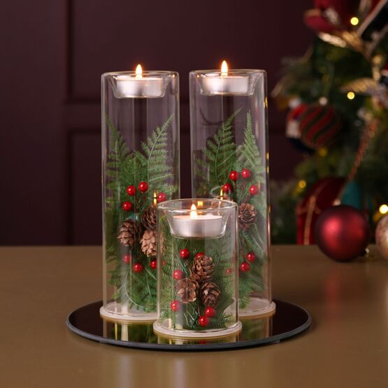 Each glass holder rests on a gold mirror tray, filled with pine cones, greenery, and red berries for a classic yet modern arrangement. The clear glass and metallic base add a touch of opulence while showcasing natural elements.