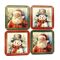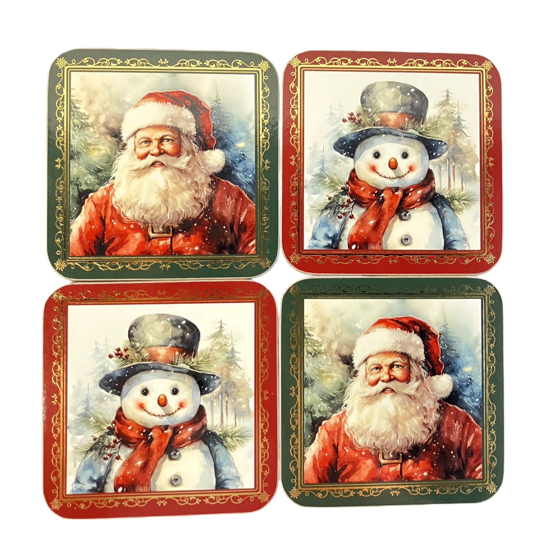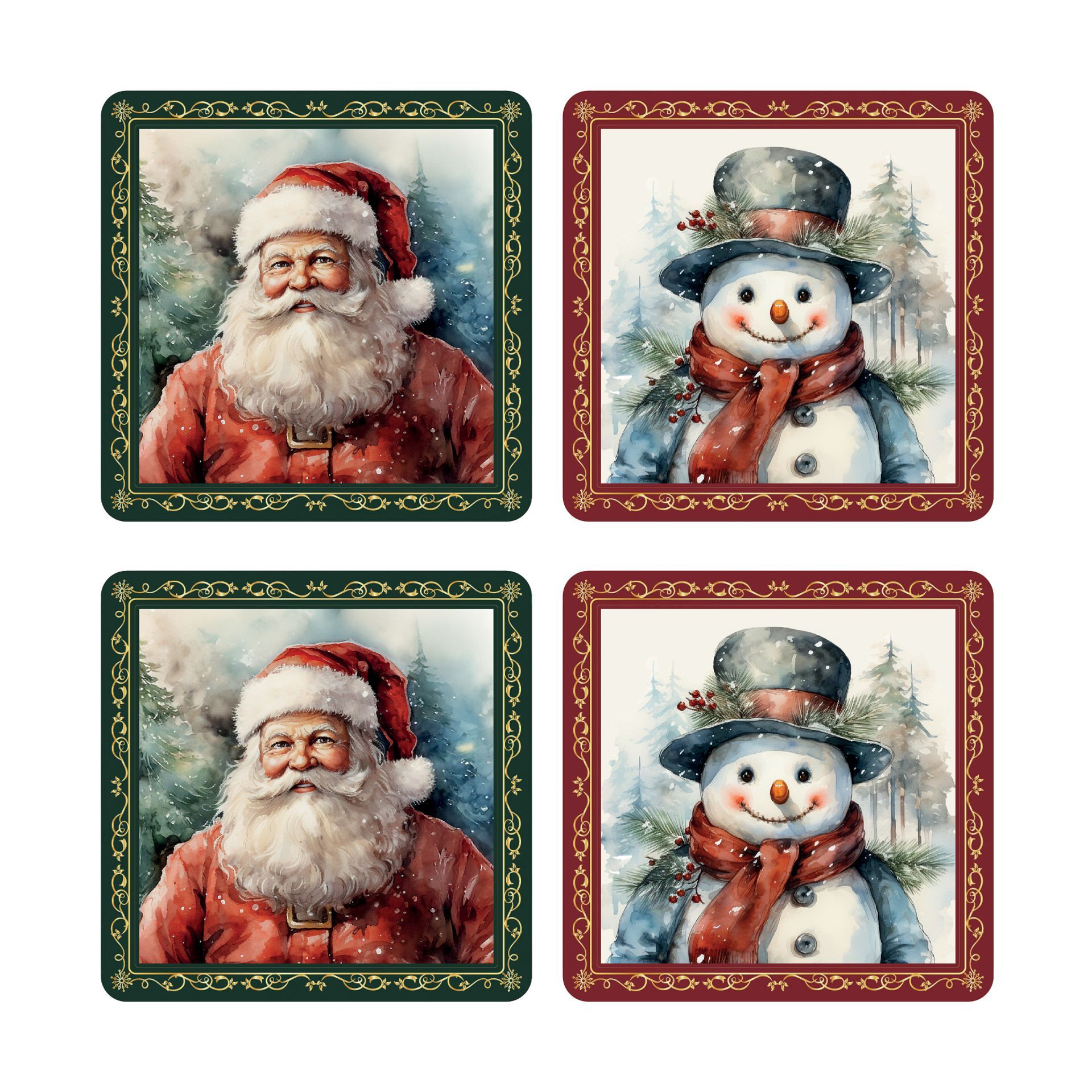The Set of 4 Wood & Cork Backed Coasters (2 of each) in Window Gift Box 10cm offers a festive way to protect surfaces. Each coaster features a holiday scene: a jolly Santa Claus in a red suit and white beard, and a cheerful snowman with a top hat and scarf. These designs repeat across the set, adding charm to your celebrations. Complete the look with more refined designs from the Regal Tidings collection.