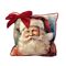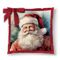 This jolly Santa Claus cushion with a warm, rosy face and a long, white beard is framed by a red border with a festive bow, is set against a snowy, winter landscape.