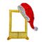 A golden, glittering frame with a red, sparkling Santa Claus hat resting on it is illuminated by a cascade of red, white, and warm string lights, adding a playful yet refined touch to seasonal décor.