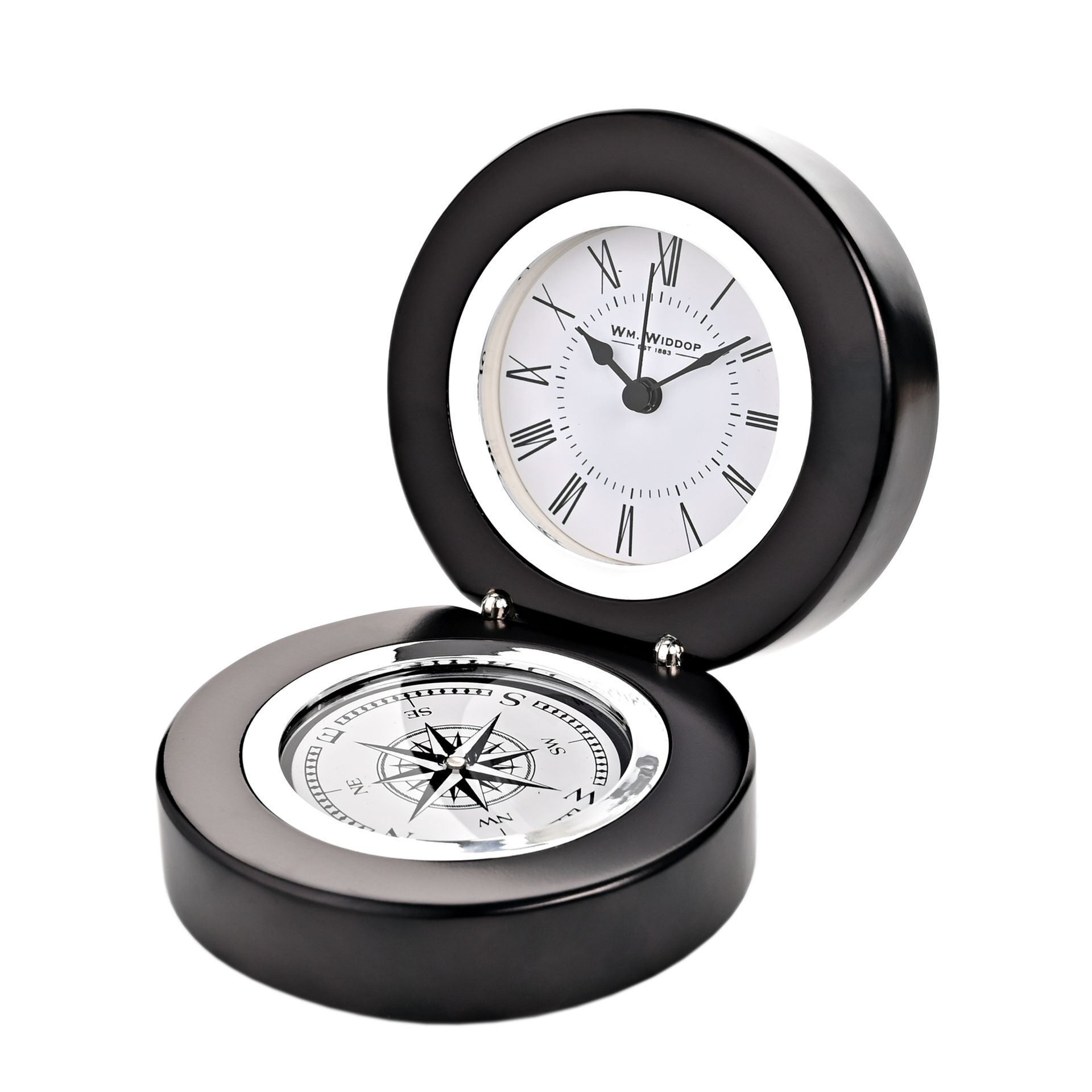 A William Widdop® Black Wood Folding Mantel Clock & Compass, blending classic elegance with practical functionality.