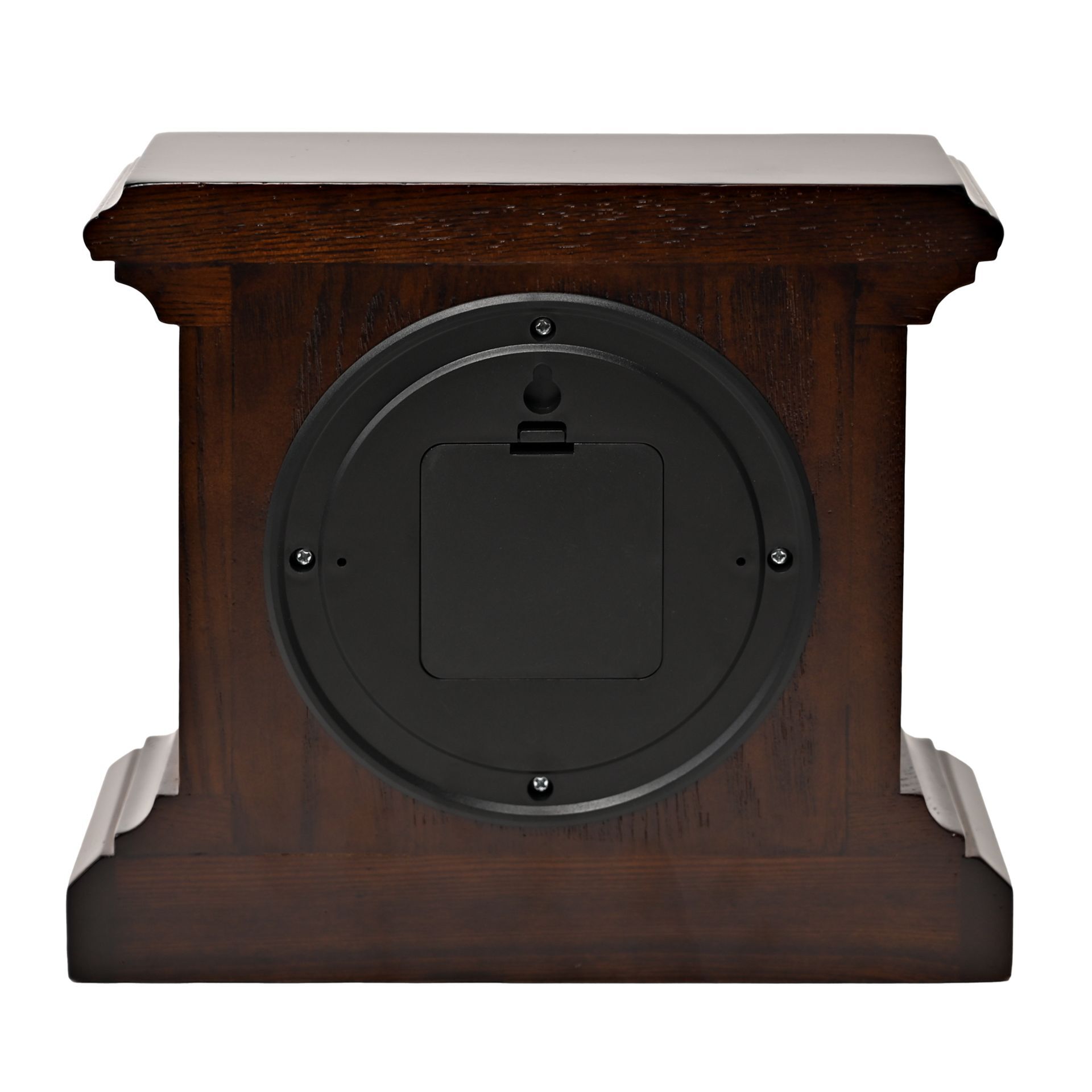 This sophisticated mantel clock has a rich, dark walnut finish, a square shape that adds a modern twist to its traditional appeal, and a clear, easy-to-read dial.