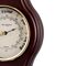 The matt, mahogany finish of this weather station is enhanced by an intricate carved eave design. Below the thermometer sits both an accurate barometer and hygrometer gauge, each surrounded by a gold metal bezel.