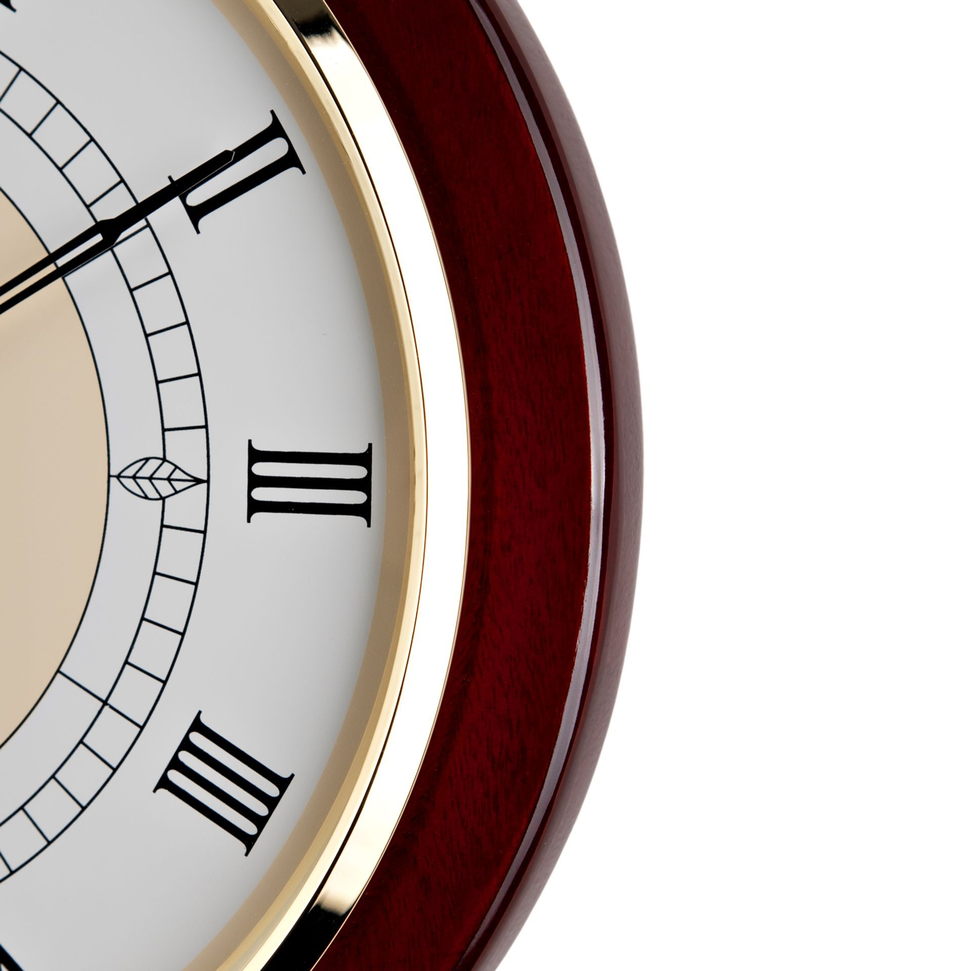 The classic piano finish of this clock/weather station is enhanced by a gold metal bezel, Roman dial, black cut-out hands and highly precise quartz movement. Beneath the clock face sits a smaller dial, featuring an accurate thermometer and hygrometer gauge, surrounded by a gold metal bezel.