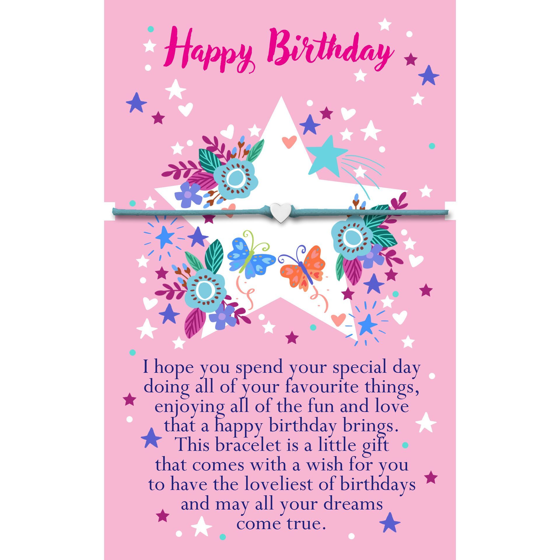 Presented as a delicate bracelet on a thoughtfully designed verse card, this piece features a warm birthday message focused on celebration, happiness and feeling cherished. It feels personal and considered, making it a lovely reminder of how special the day — and the person — truly is.