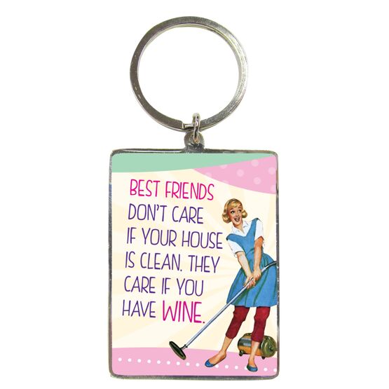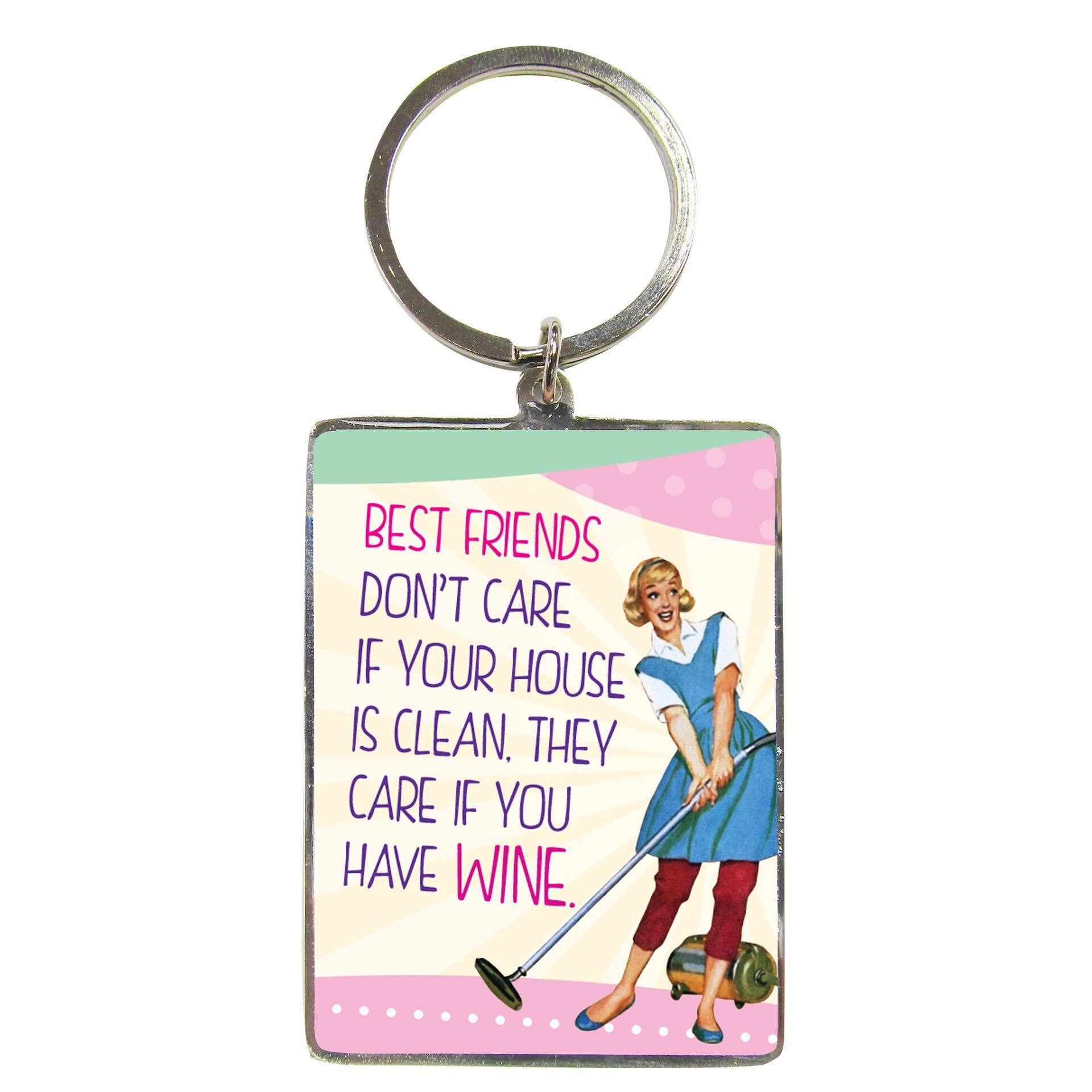 A fun retro-themed accessory full of personality. Featuring vintage-style artwork and the humorous slogan 'Best Friends don't care if your house is clean, they care if you have wine.', it adds personality to keys, handbags or everyday essentials. From WPL Gifts’ popular novelty collection, this keyring pairs bold graphics with a durable, easy-to-carry design. Measuring approximately 45mm x 60mm, it is compact yet practical for daily use. A great gift idea for those who enjoy a bit of tongue-in-cheek humour, this keyring is perfect as a small present, stocking filler or impulse buy. For more cheeky humour and witty designs, be sure to explore the extended collection.
