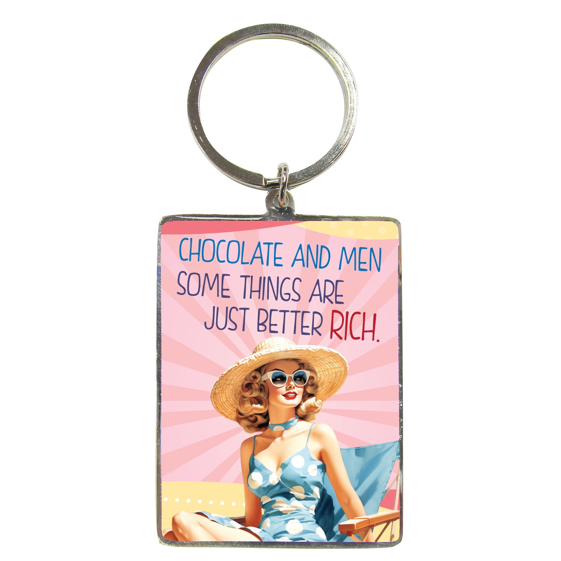 A playful vintage-style keyring packed with character. Featuring vintage-style artwork and the humorous slogan 'Chocolate and Men. Some Things are Just Better Rich.', it adds personality to keys, handbags or everyday essentials.