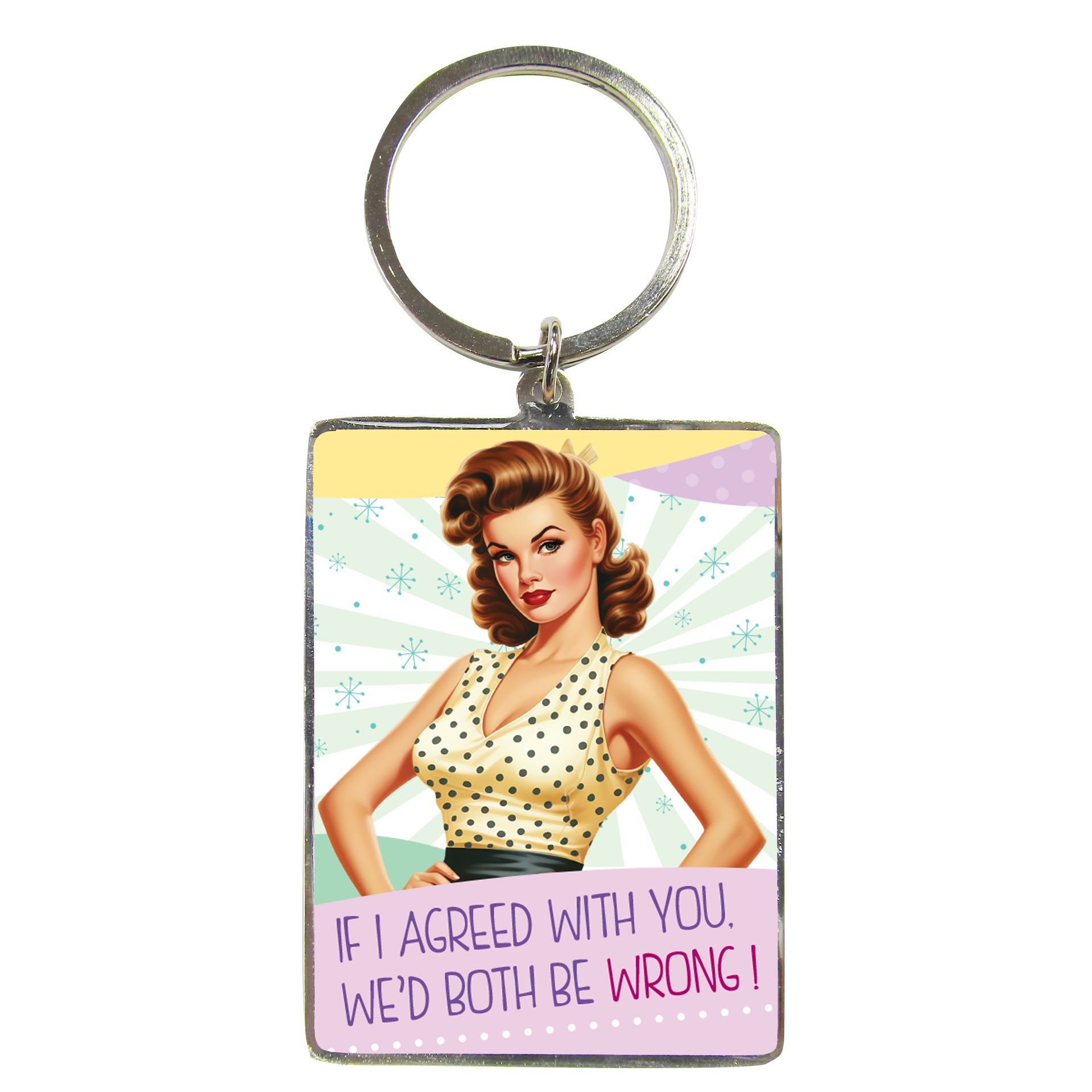 A cheeky, retro-inspired accessory designed to raise a smile. Featuring vintage-style artwork and the humorous slogan 'If I agreed with you. We'd both be wrong!', it adds personality to keys, handbags or everyday essentials.