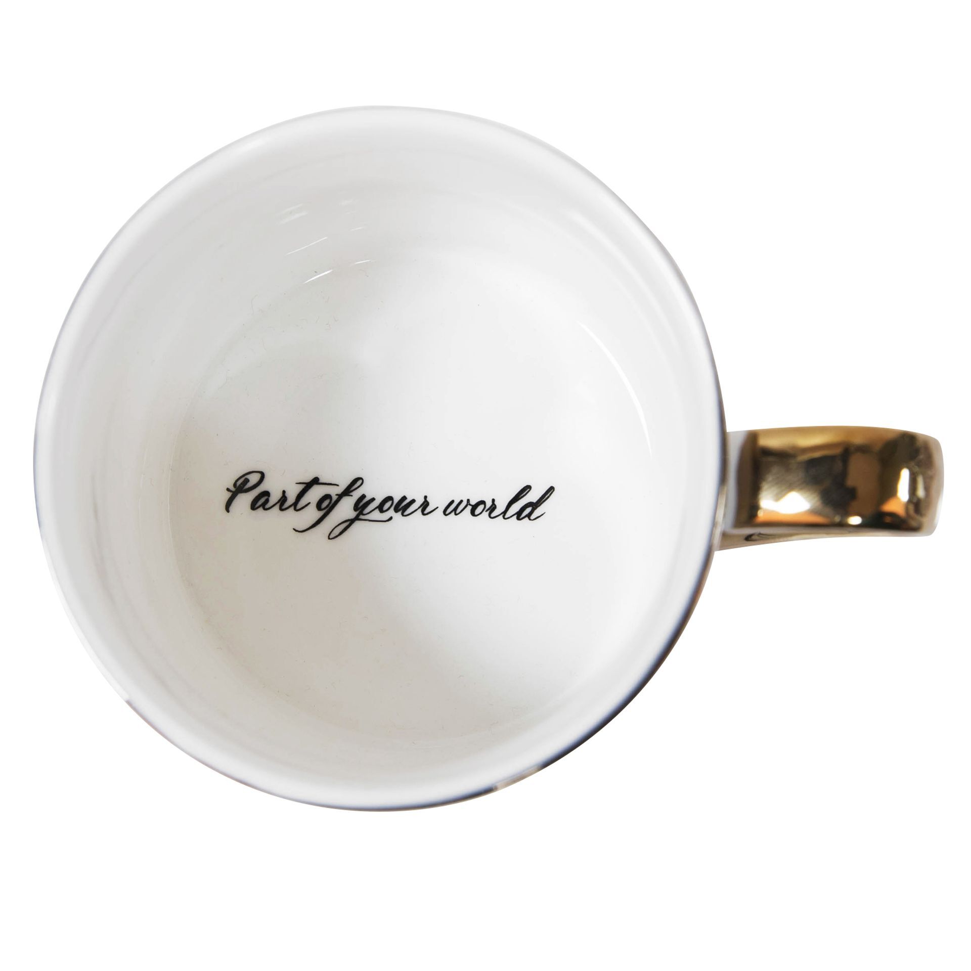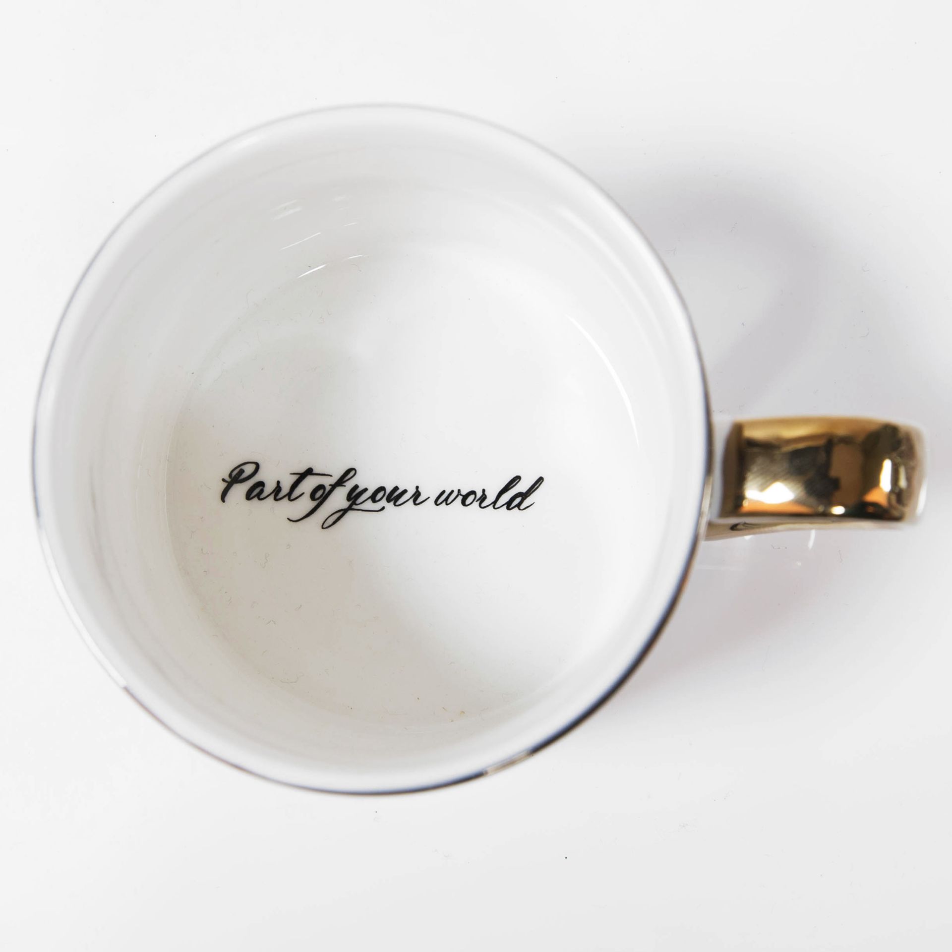A beautiful, classic pencil illustration Ariel mug, with gilt handle and 'Part of Your World' hidden message on the inside base. Complete with a black and gold foiled box, this makes a beautiful gift for a lover of Disney's wonderful characters. Part of a collectable range, featuring all time favourites from Snow White to Mickey.
