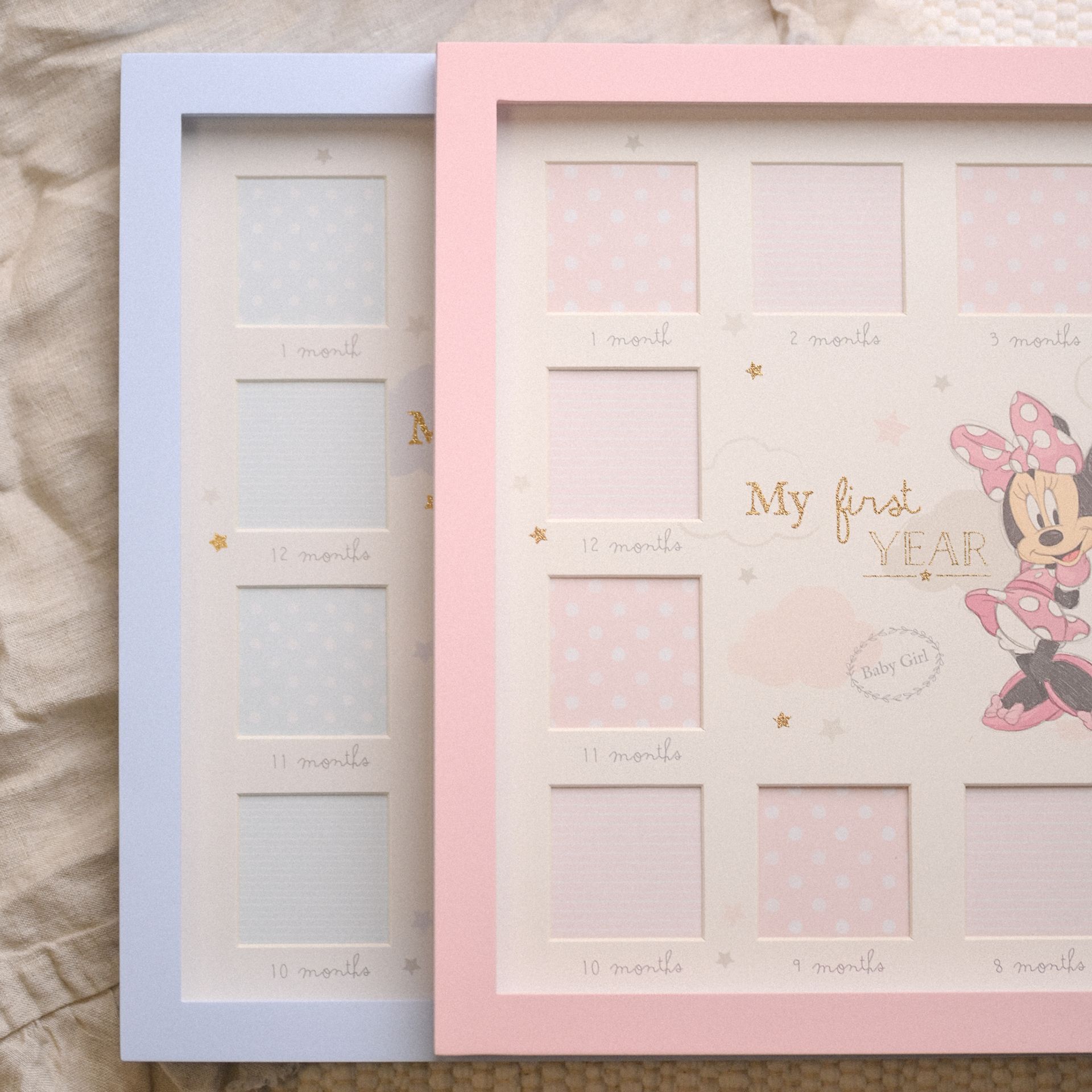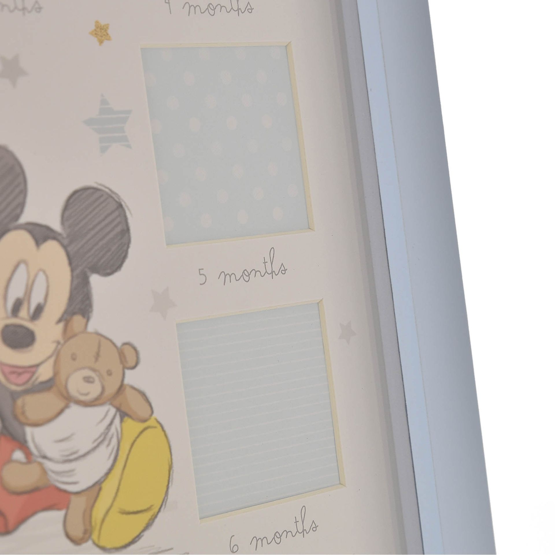 The baby blue square frame showcases a beautiful, pencil style printed image of Mickey at its centre, complete with ‘My First Year’ sentiment in gold lettering. This is surrounded by twelve small, square apertures, allowing parents to proudly display monthly photos - from one month old to their first birthday – either freestanding or on the wall.