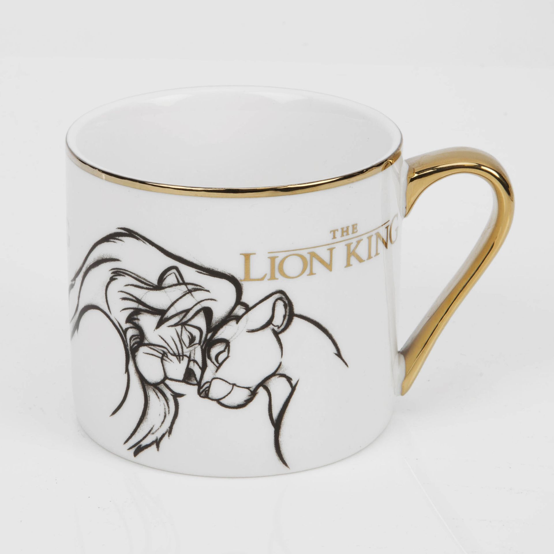 A beautiful classic pencil illustration Lion King mug, with gilt handle, lip and 'The Lion King' hidden detail on the inside base. From Disney - making dreams come true since 1923. Complete with black and gold foiled box, this makes an elegant and collectable gift for a lover of Disney's wonderful characters. Part of a collection featuring all time Disney favourites from Cinderella to Minnie. Not suitable for microwave or dishwasher.