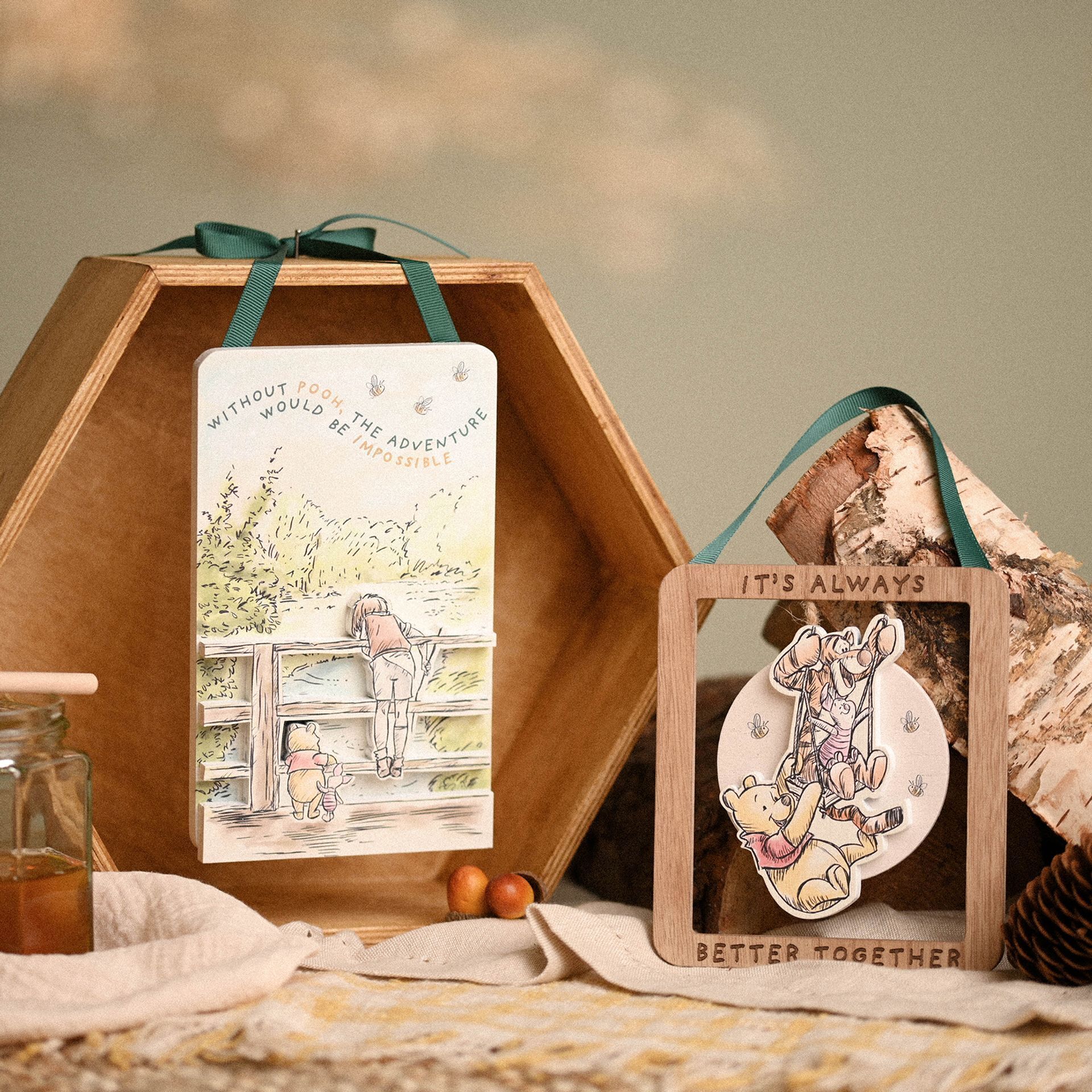 The wooden plaque showcases colourful watercolour imagery, complete with double layered Winnie the Pooh and Piglet foreground and ‘Without Pooh, The Adventure Would Be Impossible’ wording. It is designed for wall display using the attached green ribbon hanger.