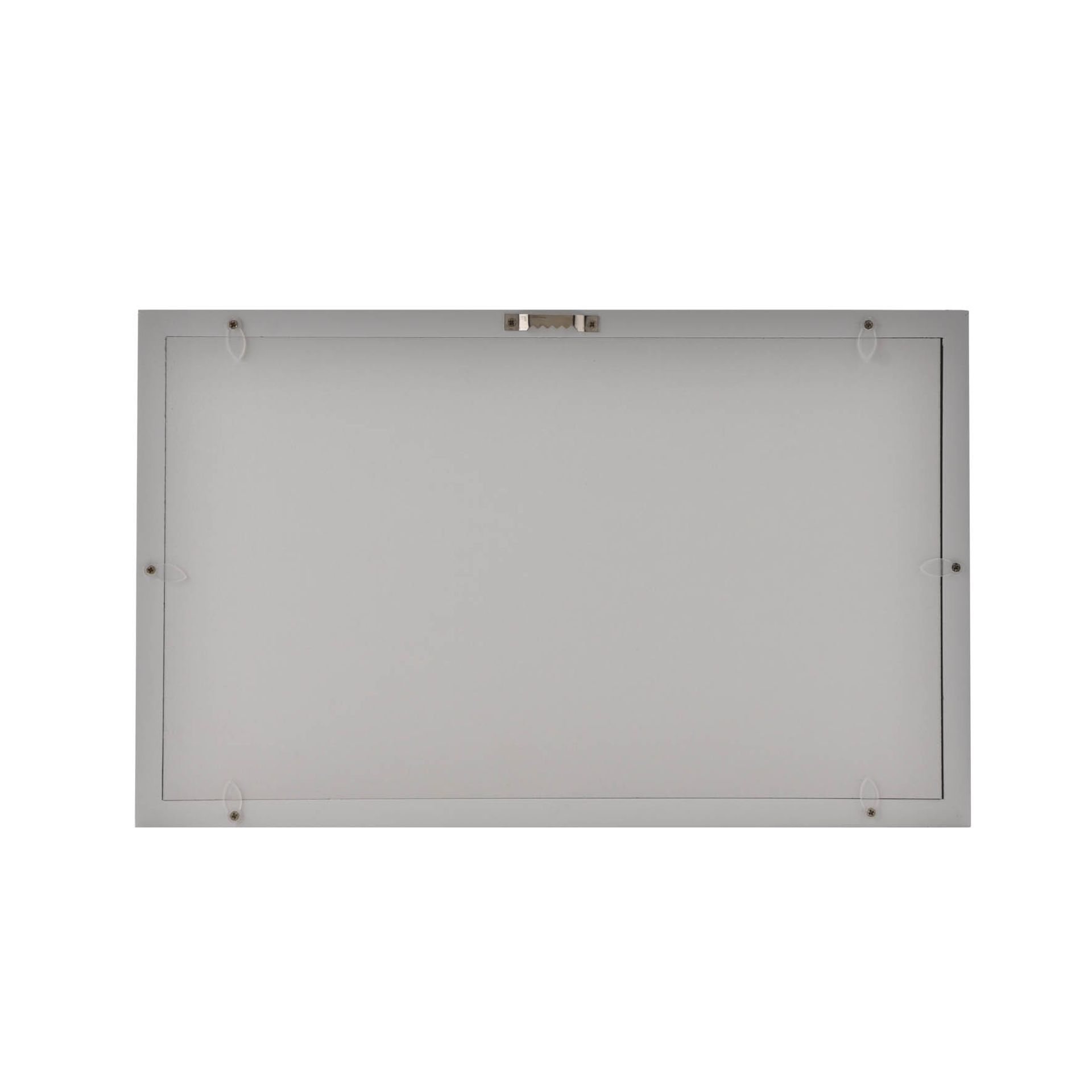 The wooden box frame has a matt white finish and is designed for wall hanging. It features two apertures: one portrait, for displaying a baby photo and one square, for presenting either a footprint or handprint using the kit provided.
