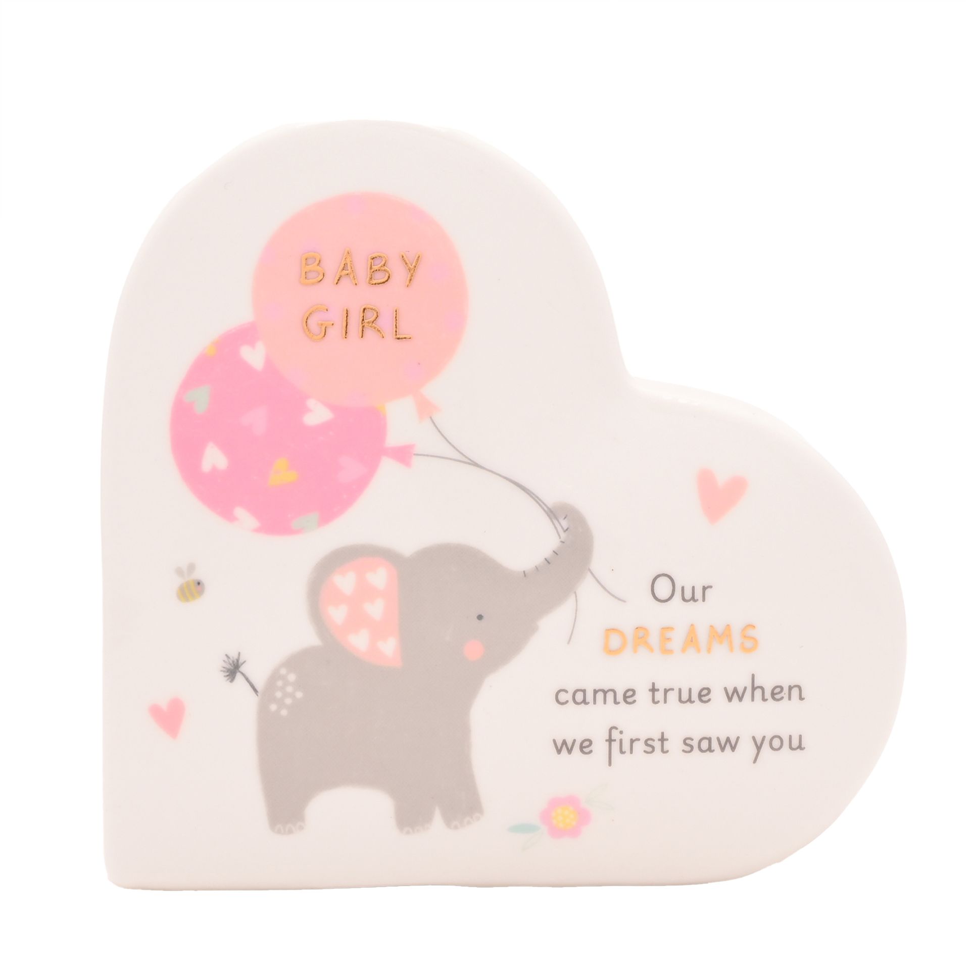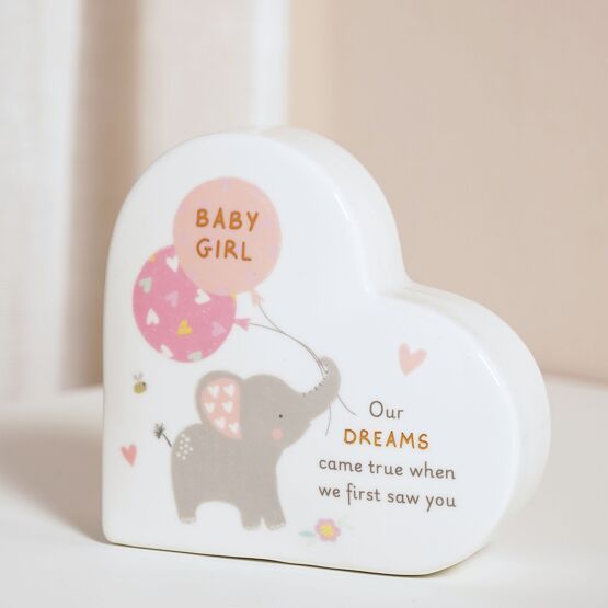 Crafted from ceramic in a classic heart shape, this charming keepsake features an adorable elephant illustration and the message "Our dreams came true when we first saw you," making it a perfect gift for a special new arrival.