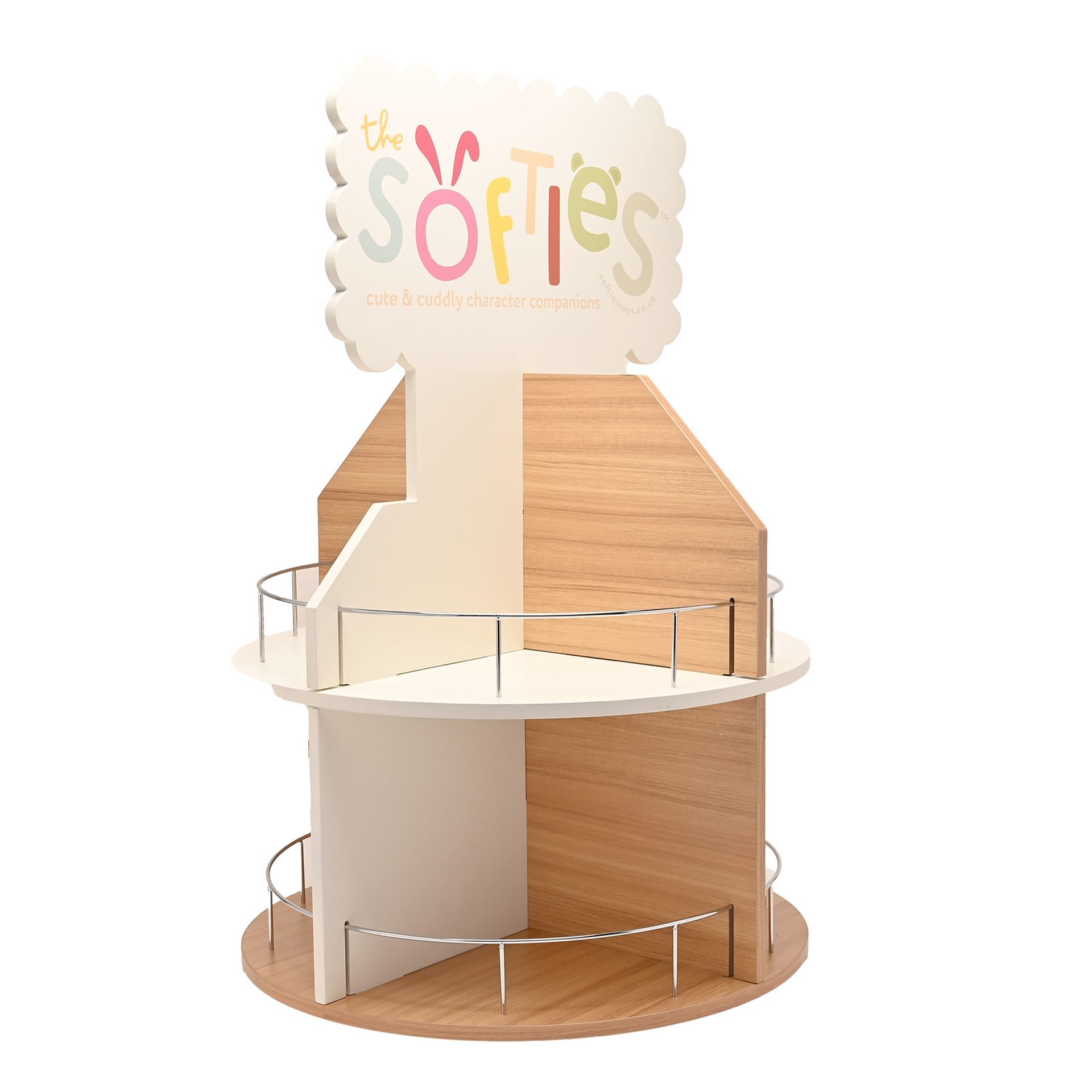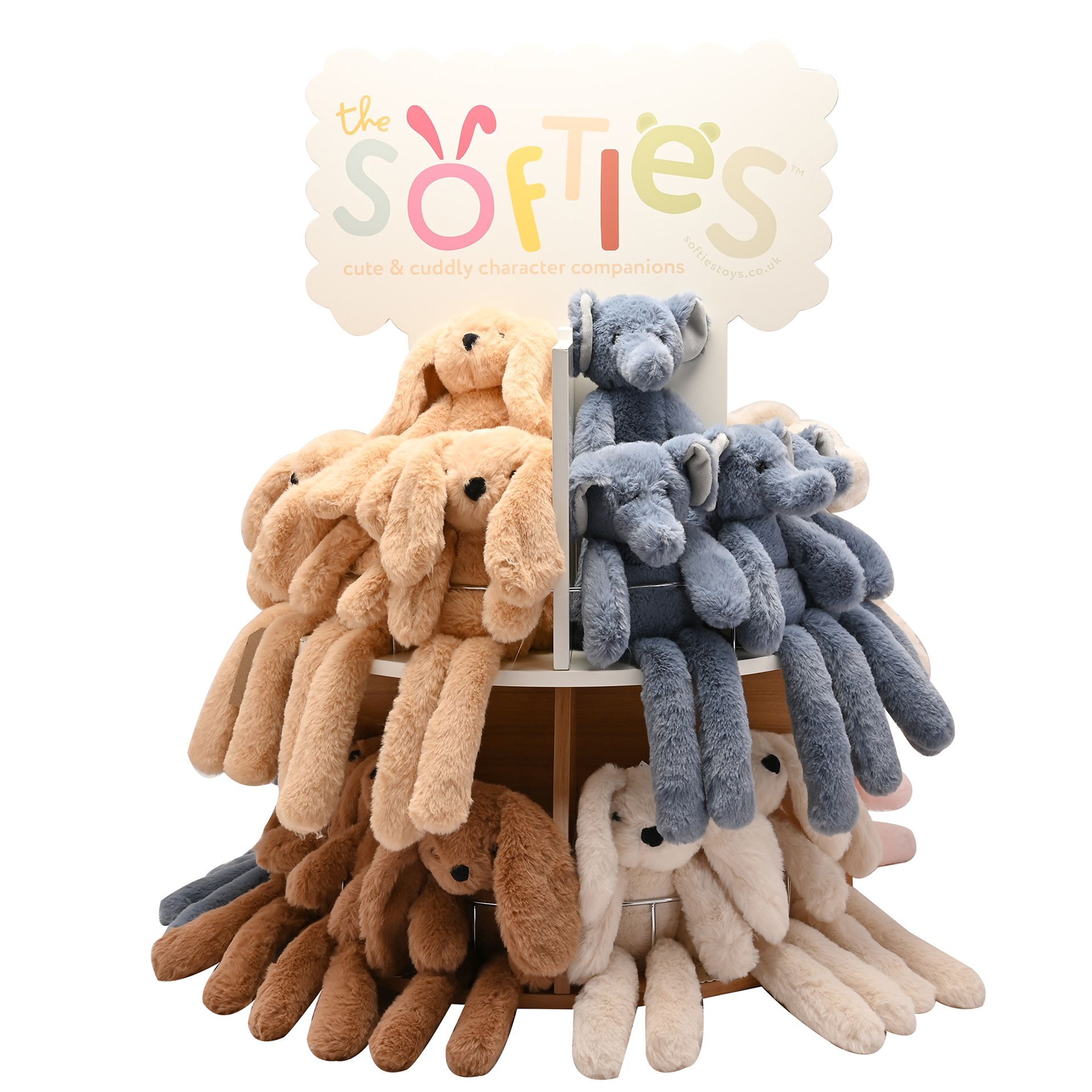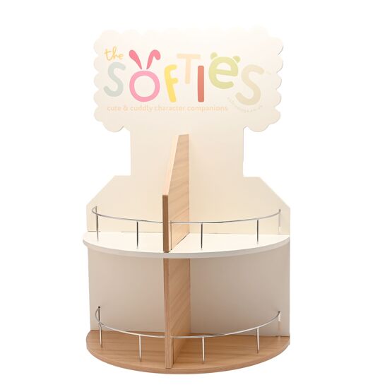 Welcome to the world of the SOFTIES. Cute and cuddly character companions to keep you company. This counter top Softies wooden display stand is the perfect size for displaying your range, effortlessly adding a touch of whimsy to any retail space. • Crafted from wood, ensuring a natural, rustic appeal. • Features multiple shelves, and eight compartments. • Countertop stand.