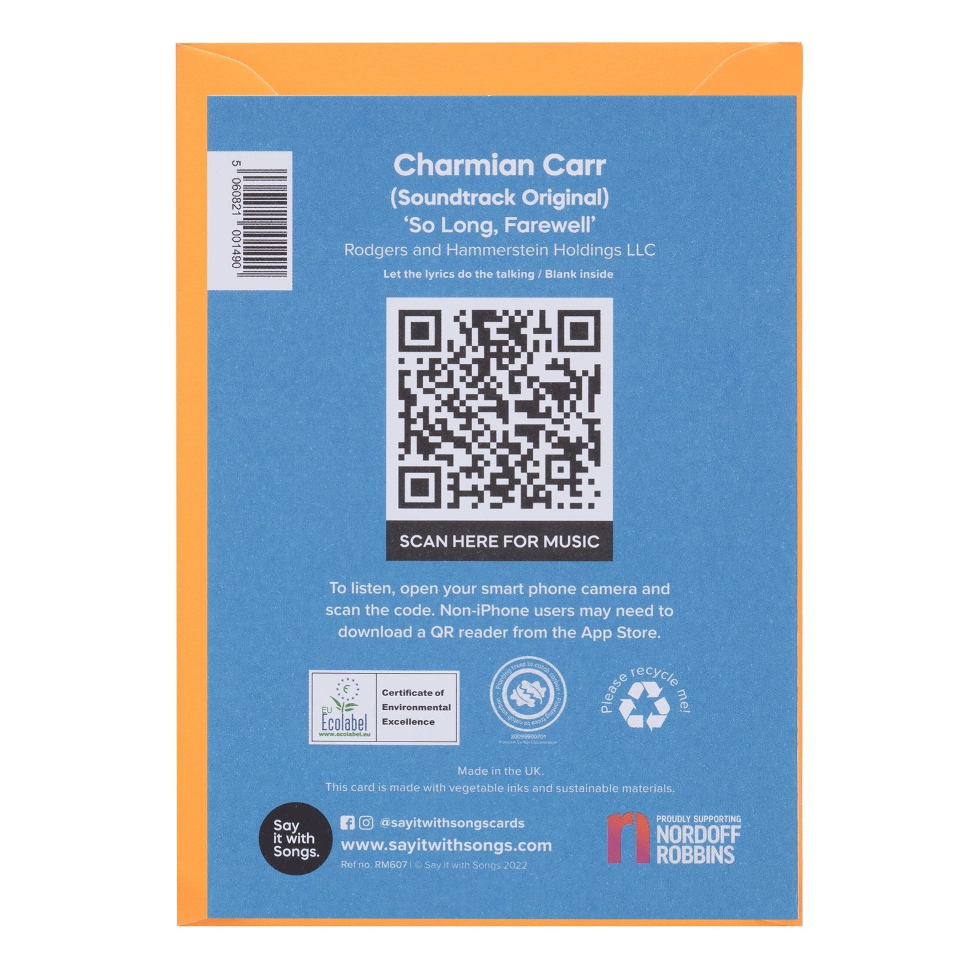 This unique music card plays the classic song ‘So long, farewell ’ by Chairmian Carr.