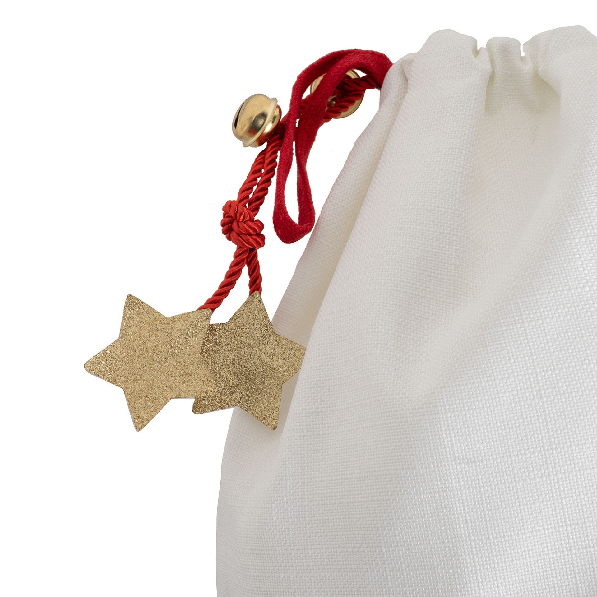 The fabric sack showcases vivid white colouring, complete with a large, embroidered ‘Dear Santa…I’ve Been Good’ title, which sits alongside images of Pooh & Piglet from Winnie the Pooh. Its drawstring opening is adorned with gold jingle bells and matching glitter stars.